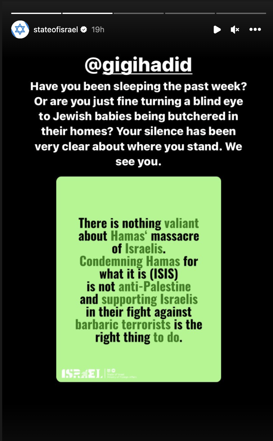 في سياق متصل، هاجمت الصفحة التي تحمل اسم stateofisrael، عبر خاصية الأستوري، في حسابها الرسمي على موقع الصور والفيديوهات “انستجرام”، عارضة الأزياء جيجي حديد، وكتبت في رسالة غاضبة لها: "هل كنت نائمة الأسبوع الماضي؟ أم أنك مغمضة عينيك عن موت أطفال يهود في بيوتهم؟.. سكوتك يبين من تدعمين.. نحن نرى ما تفعلينه جيدا".