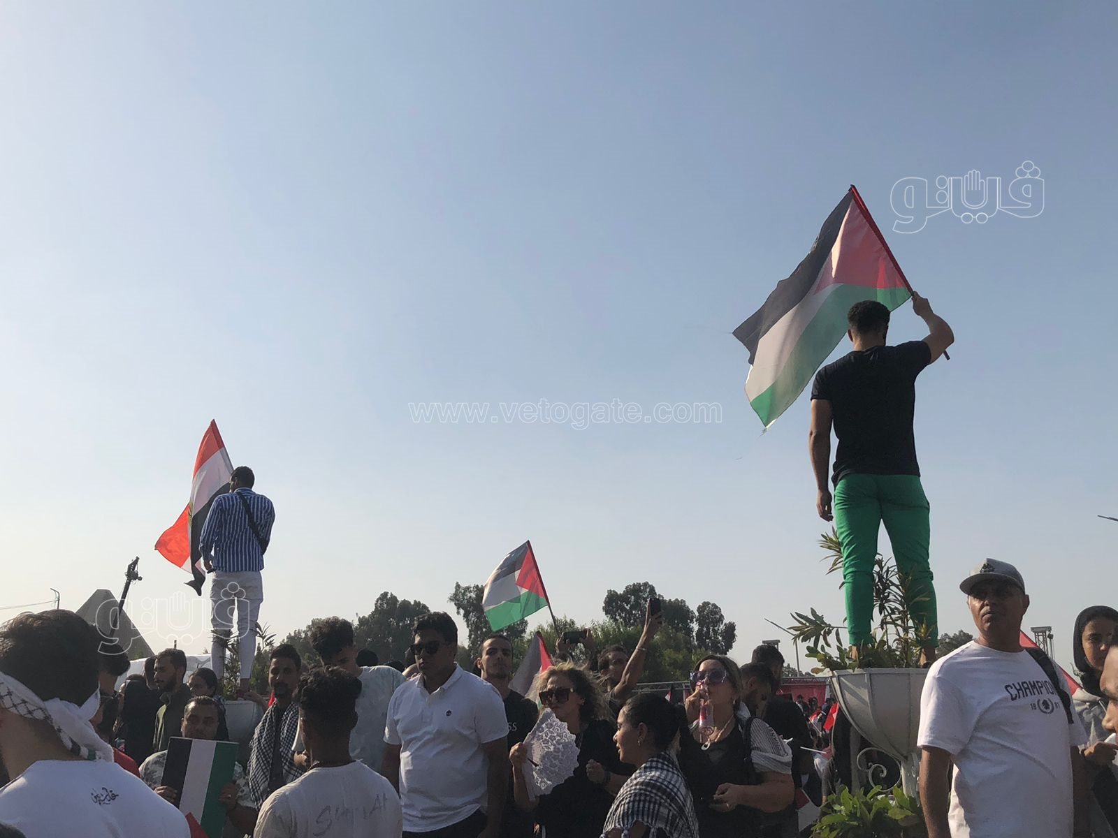 ورفع المحتشدون أعلام مصر وفلسطين ولافتات تطالب الحكومات العربية بوقف تصاعد الانتهاكات والقتل بحق الشعب الفلسطينى.