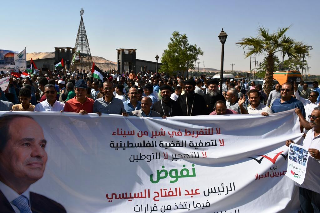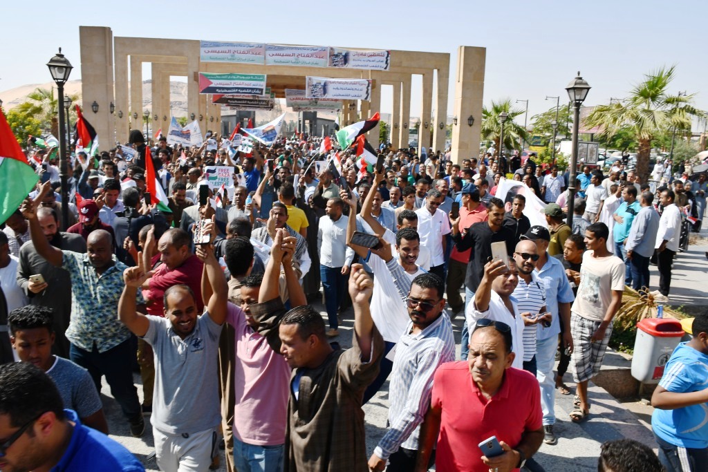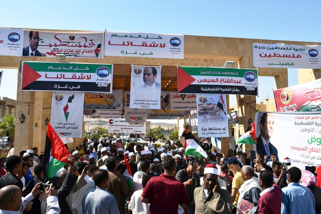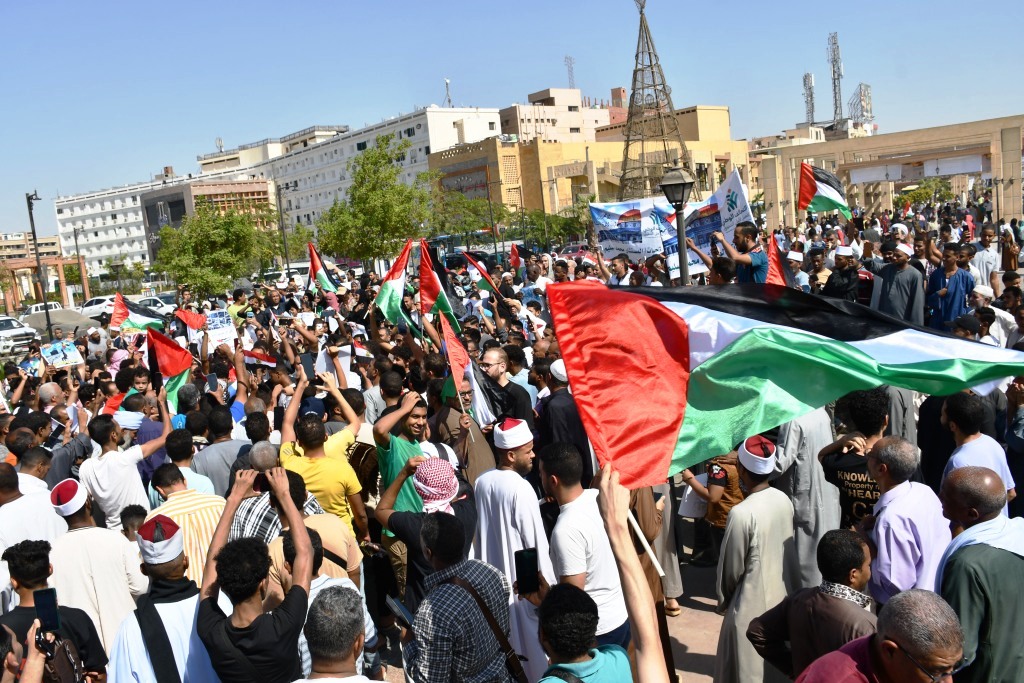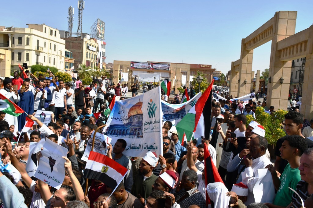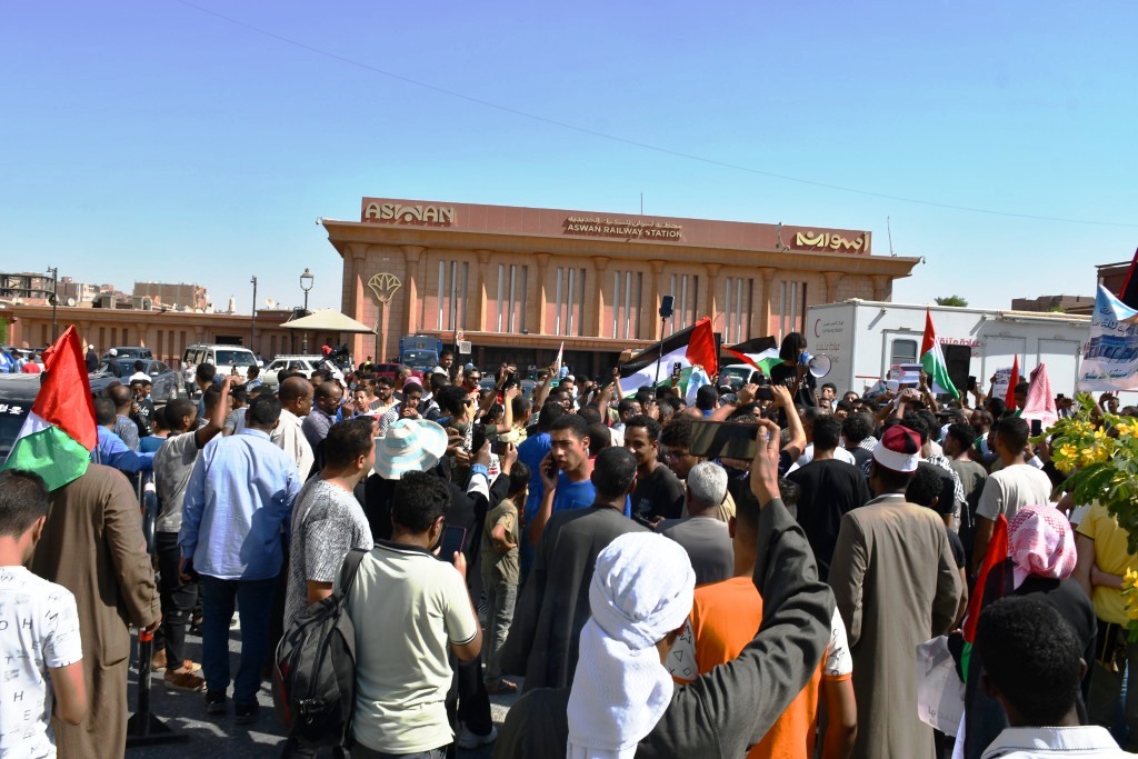 وسط مشاركة واسعة من جميع فئات المجتمع الأسوانى رافعين أعلام مصر وفلسطين فى جمعة "تحيا مصر" لتأييد الرئيس عبد الفتاح السيسى لحماية أمن مصر القومى ودعم القضية الفلسطينية، وتضامنًامع الأحداث المتصاعدة فى قطاع غزة، والذى أسفر عن سقوط مئات الضحايا الأبرياء والجرحى والمصابين من المواطنين الفلسطينيين الأشقاء.