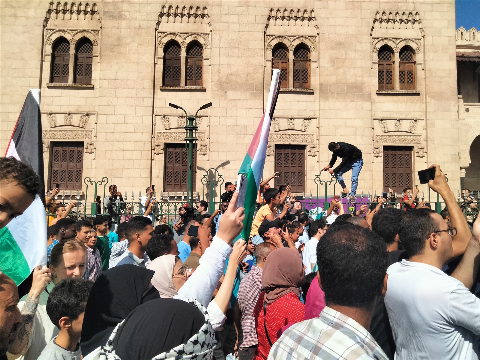 بدأ المتظاهرون في التوافد في ساعات مبكرة من الصباح وقد احتشدوا في ساحة صحن الجامع الأزهر حاملين الأعلام المصرية ومرتدين الكوفية الفلسطينية الشهيرة
