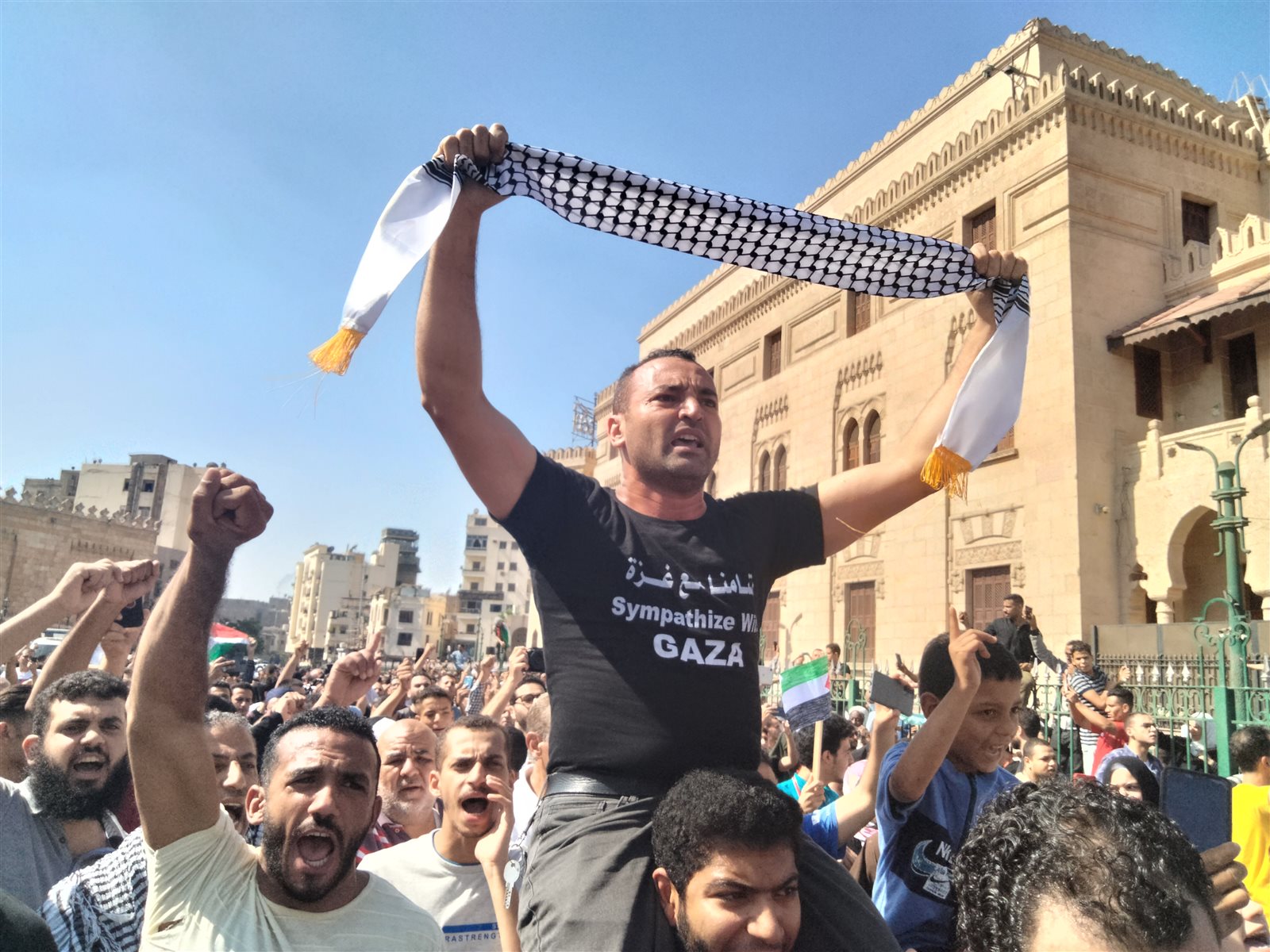 وشهدت ساحة الجامع الأزهر احتشاد آلاف المتظاهرين تنديدًا بالعدوان الإسرائيلي على القطاع قبل أن تخرج المسيرات مخترقة شارع الأزهر والمنطقة المجاورة هاتفة بشعارات الدعم والمؤازرة للشعب الفلسطيني