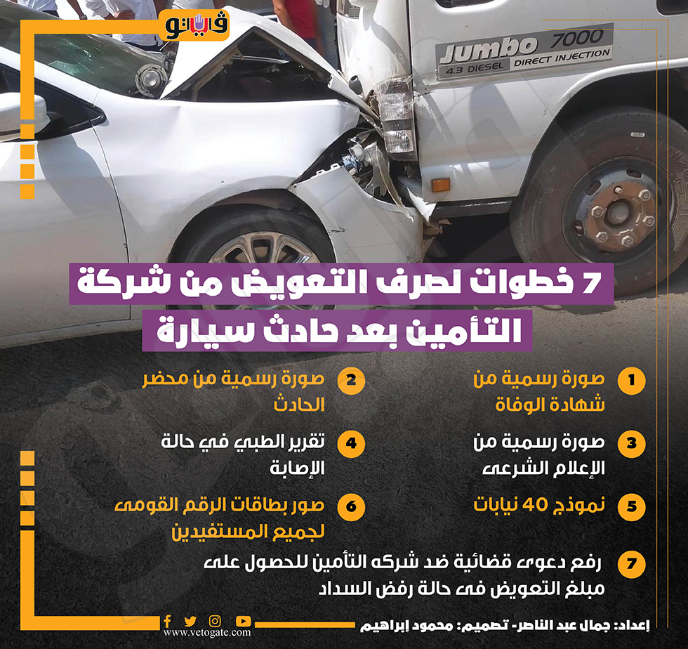 7 خطوات لصرف التعويض من شركة التأمين بعد حادث سيارة (إنفوجراف) السبت 21/أكتوبر/2023 - 05:29 م 10/21/2023 5:29:17 PM حادث تصادم سيارة، فيتو شارك طباعة 18 حجم الخط شارك طباعة الرقم القومي بطاقات الرقم القومى رفع دعوى قضائية حوادث السيارات