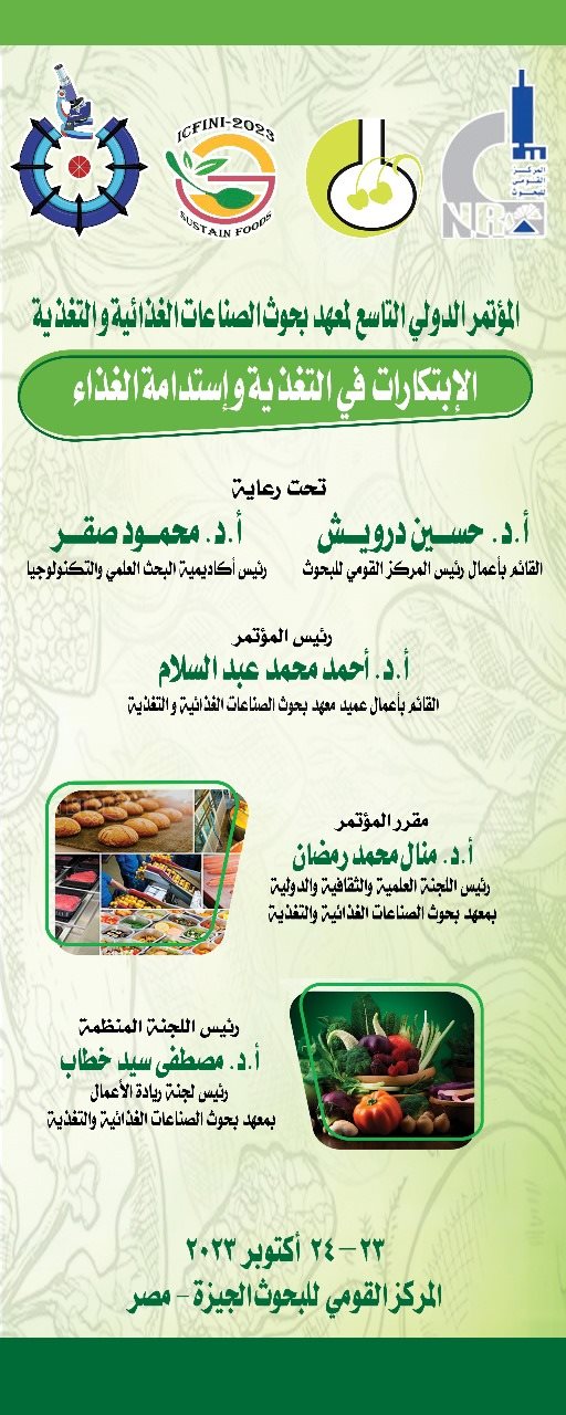 يعقد المركز القومي للبحوث المؤتمر التاسع لمعهد بحوث الصناعات الغذائية والتغذية بعنوان "الإبتكارات فى التغذية واستدامة الغذاء" فى الفترة من 23 - 24 أكتوبر 2023 تحت رعاية الدكتور حسين درويش القائم بأعمال رئيس المركز، والدكتور محمود صقر رئيس أكاديمية البحث العلمى والتكنولوجيا، وبرئاسة الدكتور أحمد عبدالسلام وكيل المعهد والقائم بأعمال عميد المعهد.