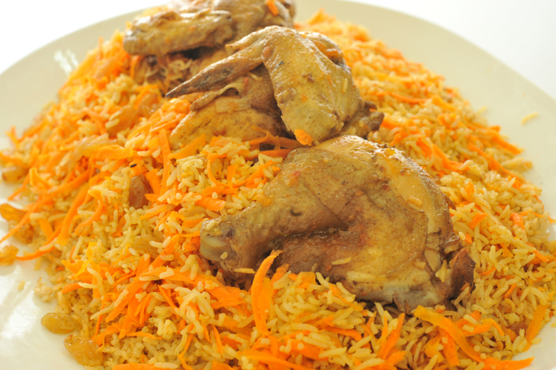 عندما يتشرب الرز كل الماء، نضيف على السطح الزبيب والجزر الذي تم تشويحه؛ حتى يأخذ البخار وطعم الرز، ثم ننتشله، لوضعه عند التقديم.