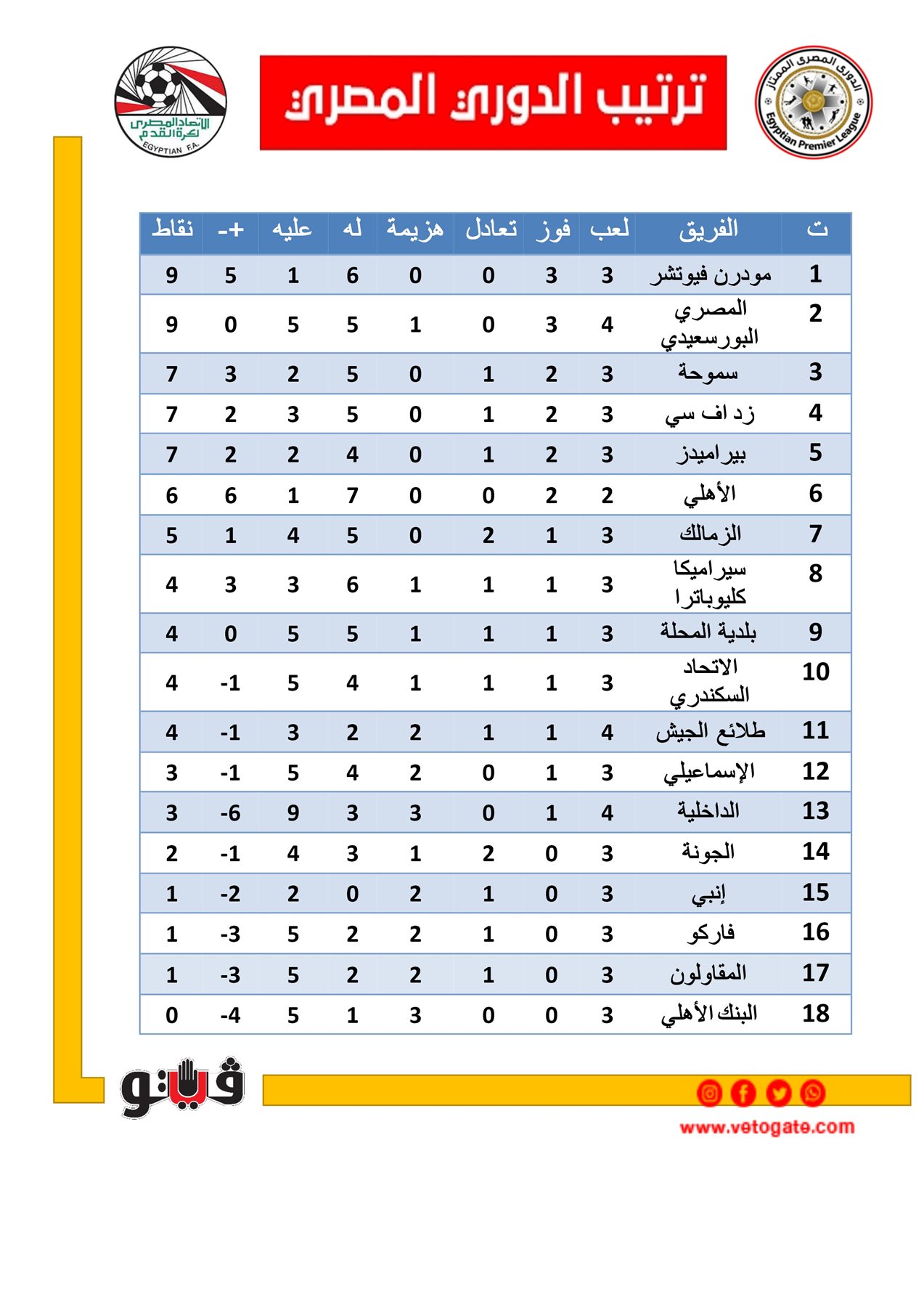 ترتيب الدوري المصري، تستكمل اليوم السبت مباريات الجولة الرابعة لبطولة الدوري المصري الممتاز بإقامة ثلاث مباريات بين بلدية المحلة ضد الاتحاد السكندري، وانبي ضد البنك الأهلي، والزمالك ضد سموحة.