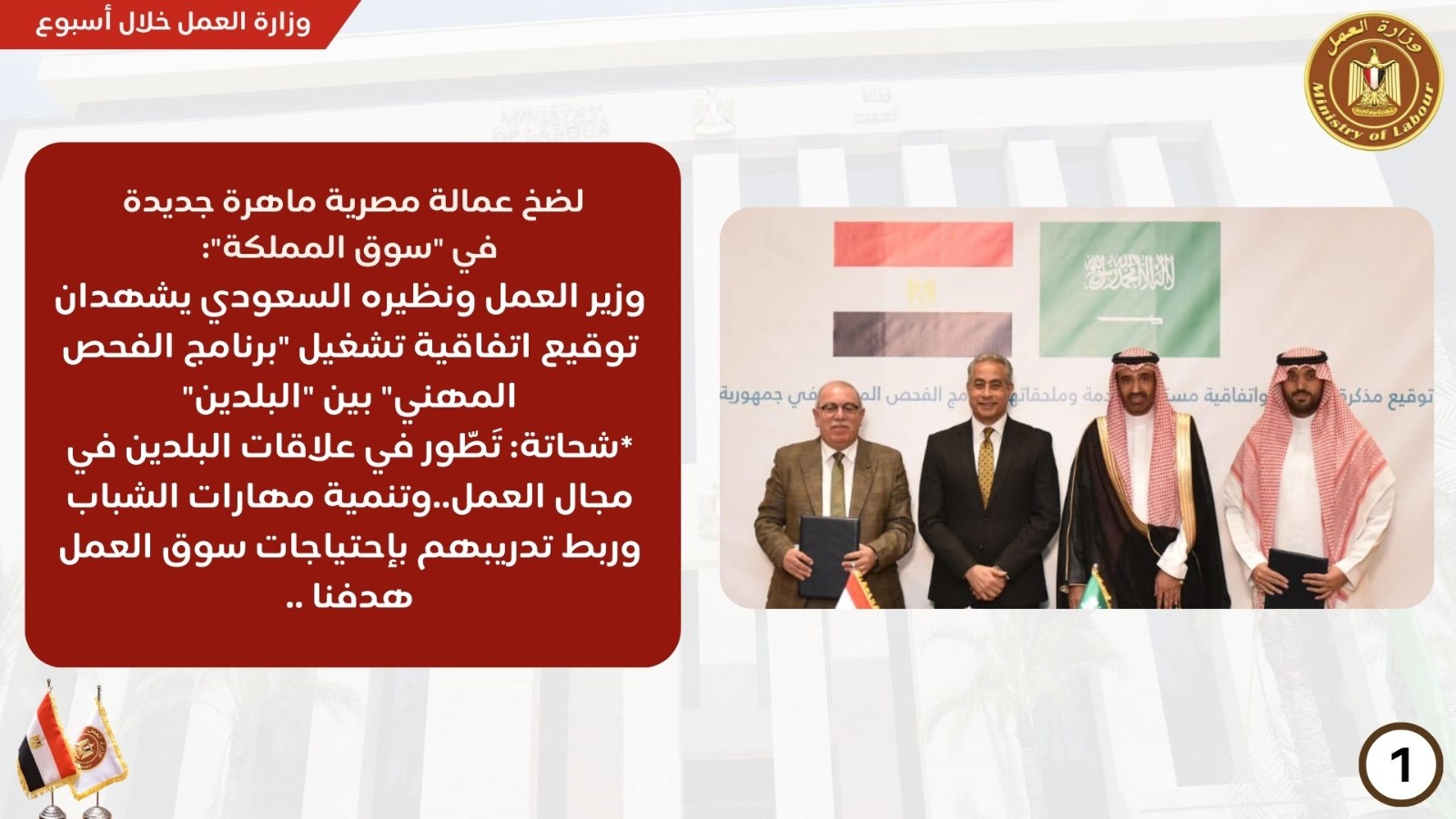 خلال الأسبوع الذي يرصده الإنفوجراف،شهد حسن شحاتة وزير العمل،ونظيره السعودي أحمد الراجحي وزير الموارد البشرية والتنمية الاجتماعية،بأحد فنادق القاهرة،توقيع "مذكرة تفاهم"،و"إتفاقية الفحص المهني" بهدف التحقق من إمتلاك العامل المصري للمؤهلات والمهارات المطلوبة للعمل في السعودية،وضخ عمالة مصرية ماهرة جديدة في "سوق المملكة"..