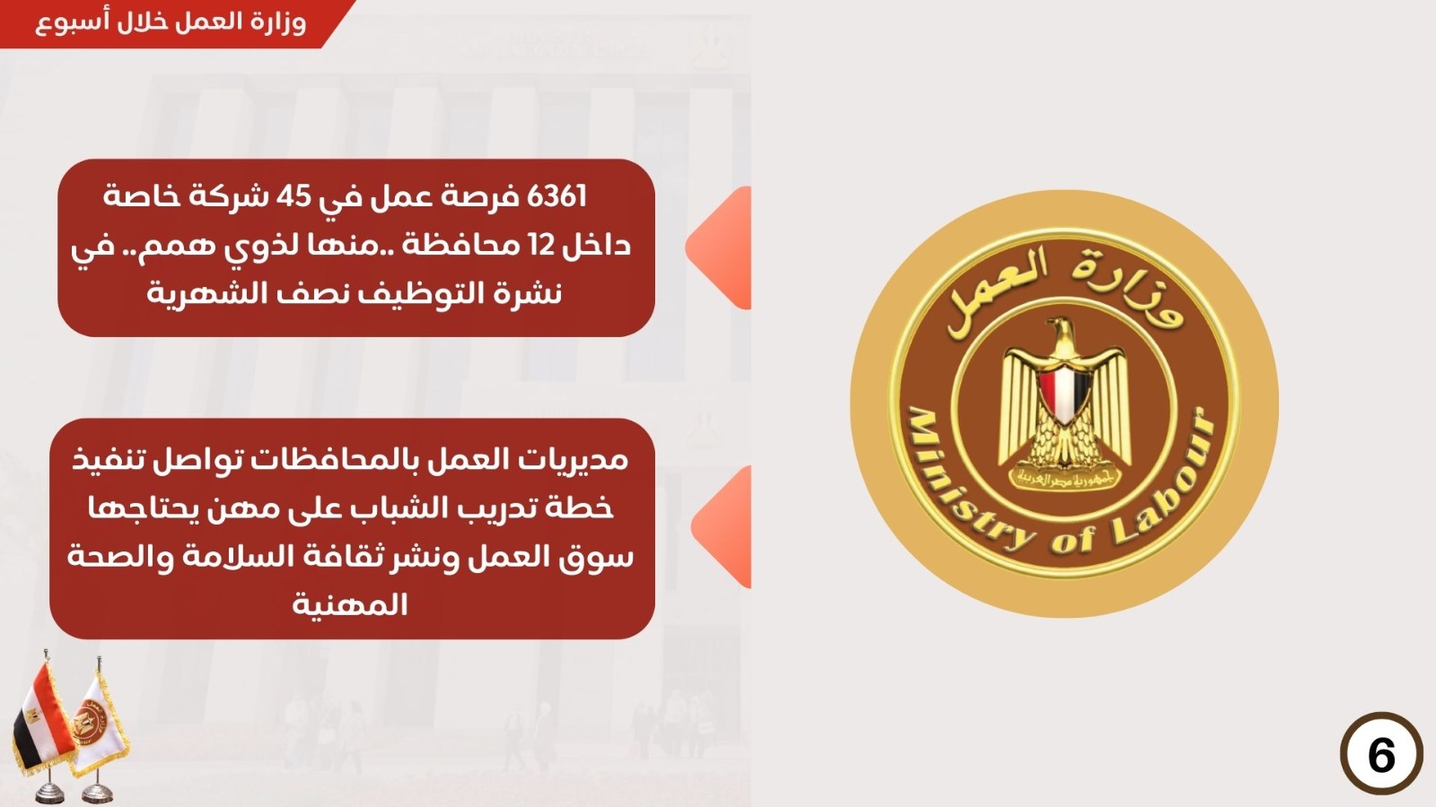 وخففت من حِدة تحديات "سوق العمل"،إضافة إلى توزيع نشرة التوظيف التي أعلنت هذا الأسبوع عن توفير 6361 فرصة عمل في 45 شركة خاصة داخل 12 محافظة،منها لذوي همم،والتي من خلالها يجدد الوزير شحاتة توجيهه إلى "المديريات" بالمتابعة حتى استلام "فرص العمل" والتأكد من تطبيق الحد الأدنى للأجور...إلى التفاصيل..