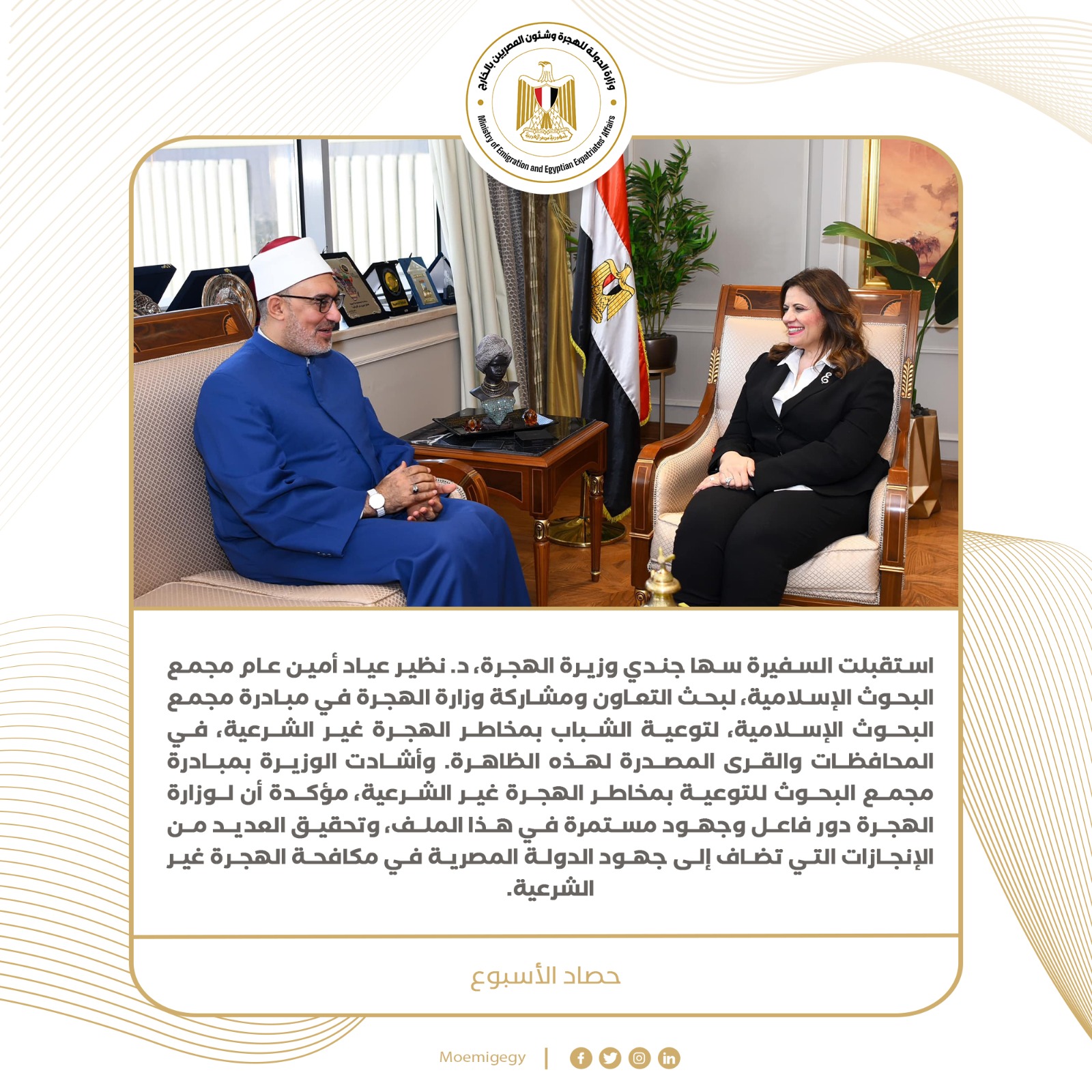 3- استقبلت السفيرة سها جندي وزيرة الهجرة، د. نظير عياد أمين عام مجمع البحوث الإسلامية، لبحث التعاون ومشاركة وزارة الهجرة في مبادرة مجمع البحوث الإسلامية، لتوعية الشباب بمخاطر الهجرة غير الشرعية، في المحافظات والقرى المصدرة لهذه الظاهرة. وأشادت الوزيرة بمبادرة مجمع البحوث للتوعية بمخاطر الهجرة غير الشرعية، مؤكدة أن لوزارة الهجرة دور فاعل وجهود مستمرة في هذا الملف، وتحقيق العديد من الإنجازات التي تضاف إلى جهود الدولة المصرية في مكافحة الهجرة غير الشرعية.