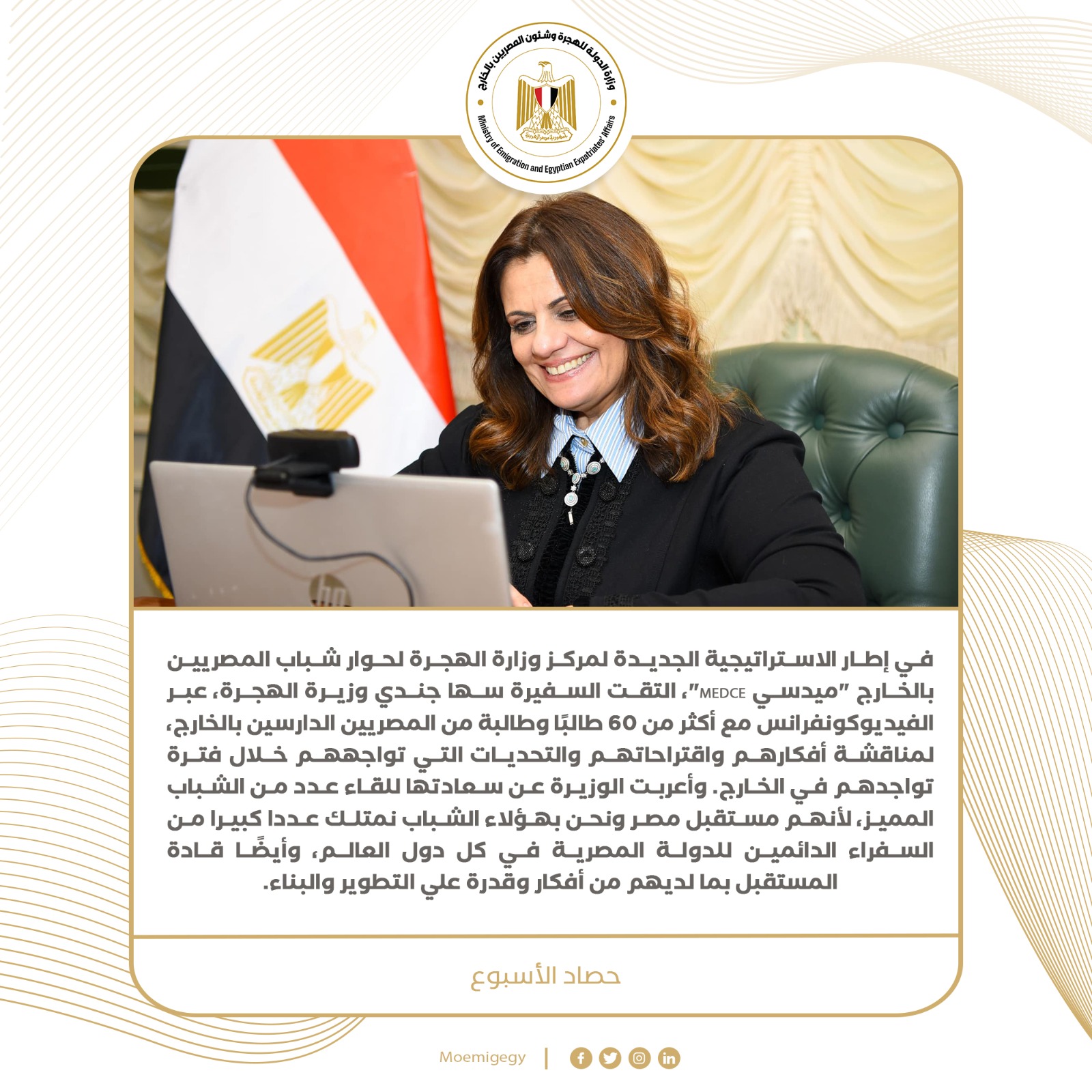 4- في إطار الاستراتيجية الجديدة لمركز وزارة الهجرة لحوار شباب المصريين بالخارج "ميدسي MEDCE"، التقت السفيرة سها جندي وزيرة الهجرة، عبر الفيديوكونفرانس مع أكثر من 60 طالبًا وطالبة من المصريين الدارسين بالخارج، لمناقشة أفكارهم واقتراحاتهم والتحديات التي تواجههم خلال فترة تواجدهم في الخارج. وأعربت الوزيرة عن سعادتها للقاء عدد من الشباب المميز، لأنهم مستقبل مصر ونحن بهؤلاء الشباب نمتلك عددا كبيرا من السفراء الدائمين للدولة المصرية في كل دول العالم، وأيضًا قادة المستقبل بما لديهم من أفكار وقدرة علي التطوير والبناء، كما أشادت سيادتها بالدور الهام الذي قام به "مينا مكين" كمنسق لعمل مجموعة شباب "ميدسي MEDCE"، والشباب رؤساء مجموعات العمل المختلفة بالمركز، والشباب من سفراء المركز خلال الأزمات التي حدثت جراء الحرب الروسية الأوكرانية والأزمة السودانية وأيضًا زلزال تركيا.