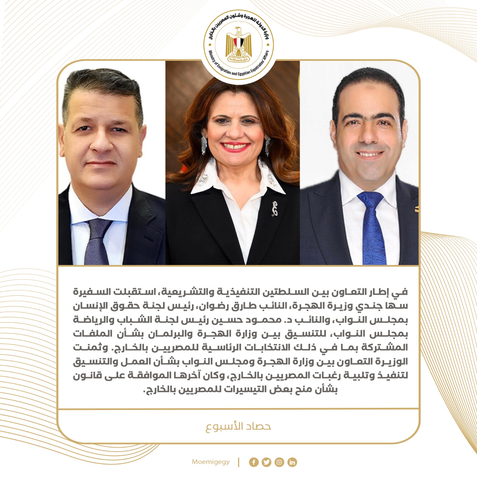 5- في إطار التعاون بين السلطتين التنفيذية والتشريعية، استقبلت السفيرة سها جندي وزيرة الهجرة، النائب طارق رضوان، رئيس لجنة حقوق الإنسان بمجلس النواب، والنائب د. محمود حسين رئيس لجنة الشباب والرياضة بمجلس النواب، للتنسيق بين وزارة الهجرة والبرلمان بشأن الملفات المشتركة بما في ذلك الانتخابات الرئاسية للمصريين بالخارج. وثمنت الوزيرة التعاون بين وزارة الهجرة ومجلس النواب بشأن العمل والتنسيق لتنفيذ وتلبية رغبات المصريين بالخارج، وكان آخرها الموافقة على قانون بشأن منح بعض التيسيرات للمصريين بالخارج، وإعادة فتح مبادرة استيراد السيارات من الخارج، مشيدة بما لمسته من إيجابية لدى السادة أعضاء البرلمان تجاه القانون عند مناقشته خلال الجلسة العامة، وإبداء عدد منهم لبعض المقترحات التي من شأنها تحقيق المزيد من التيسيرات لأبنائنا بالخارج، مؤكدة ضرورة العمل على حث المصريين بالخارج والشباب من الجيلين الثاني والثالث لصناعة مستقبل وطنهم، والمشاركة في الانتخابات الرئاسية المقبلة.