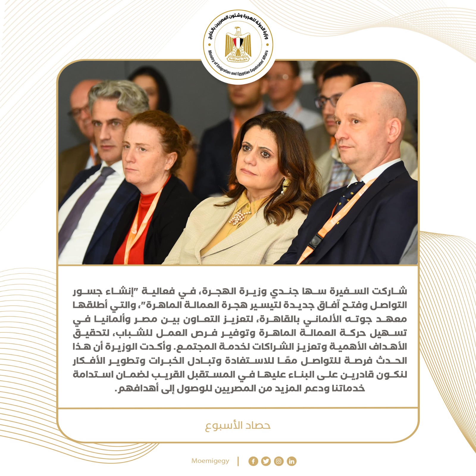7- شاركت السفيرة سها جندي وزيرة الهجرة، في فعالية "إنشاء جسور التواصل وفتح آفاق جديدة لتيسير هجرة العمالة الماهرة"، والتي أطلقها معهد جوته الألماني بالقاهرة، لتعزيز التعاون بين مصر وألمانيا في تسهيل حركة العمالة الماهرة وتوفير فرص العمل للشباب، لتحقيق الأهداف الأهمية وتعزيز الشراكات لخدمة المجتمع. وأكدت الوزيرة أن هذا الحدث فرصة للتواصل معًا للاستفادة وتبادل الخبرات وتطوير الأفكار لنكون قادرين على البناء عليها في المستقبل القريب لضمان استدامة خدماتنا ودعم المزيد من المصريين للوصول إلى أهدافهم، وأيضًا أن نثبت معًا أن التعاون المصري الألماني ليس مجرد سياسات على الورق وفي المؤتمرات، ولكن الأهم من ذلك أنه يتمثل في أفعال تحدث على أرض الواقع، مضيفة أن الفعالية تعزز التعاون المباشر بين وزارة الهجرة والجانب الألماني لتسهيل حركة العمالة الماهرة من مصر إلى ألمانيا، وإتاحة فرص التدريب والعمل لهم في سوق العمل الألماني وفتح قنوات تعاون جديدة في هذا الصدد.
