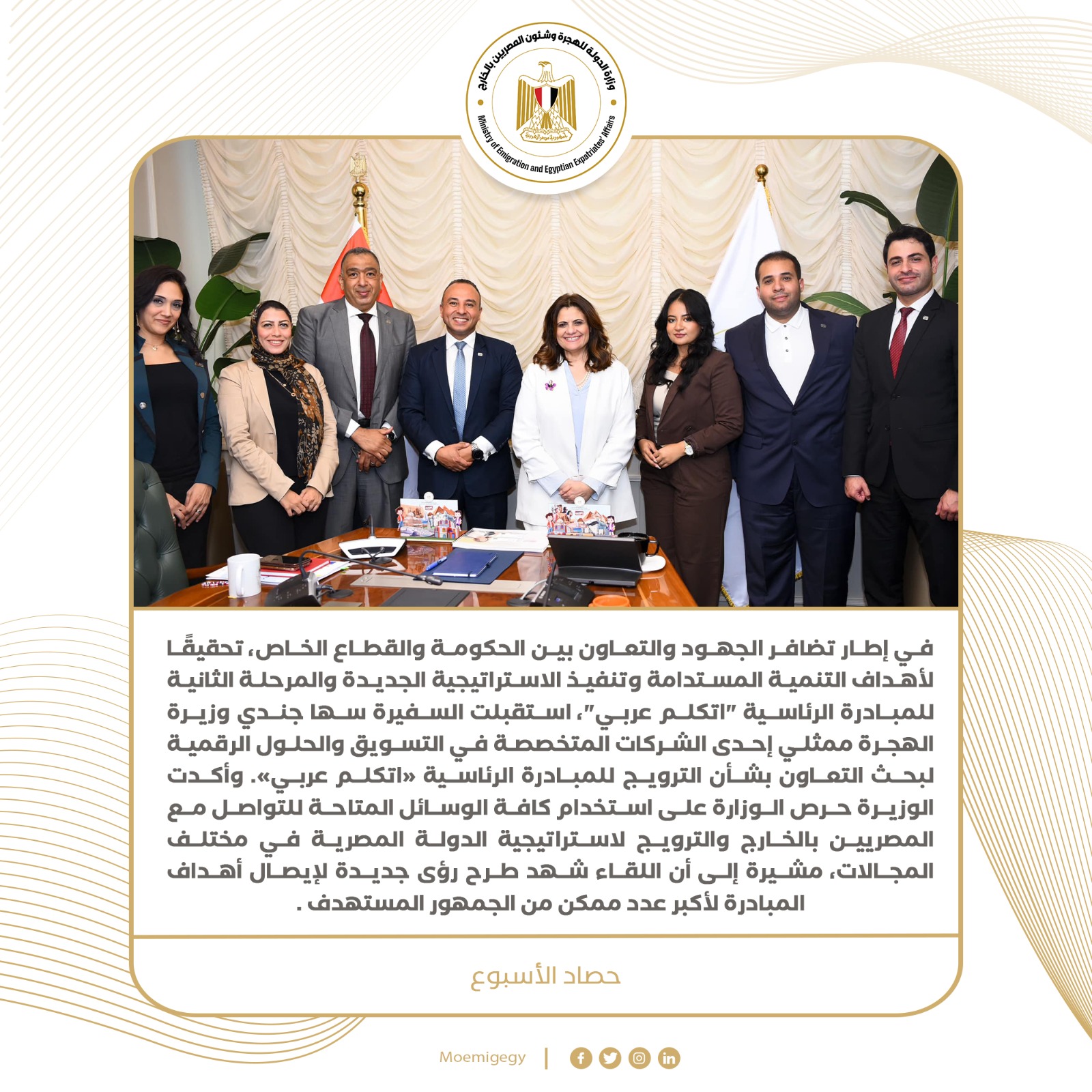 2- في إطار تضافر الجهود والتعاون بين الحكومة والقطاع الخاص، تحقيقًا لأهداف التنمية المستدامة وتنفيذ الاستراتيجية الجديدة والمرحلة الثانية للمبادرة الرئاسية "اتكلم عربي"، استقبلت السفيرة سها جندي وزيرة الهجرة ممثلي إحدى الشركات المتخصصة في التسويق والحلول الرقمية لبحث التعاون بشأن الترويج للمبادرة الرئاسية «اتكلم عربي». وأكدت الوزيرة حرص الوزارة على استخدام كافة الوسائل المتاحة للتواصل مع المصريين بالخارج والترويج لاستراتيجية الدولة المصرية في مختلف المجالات، مشيرة إلى أن اللقاء شهد طرح رؤى جديدة لإيصال أهداف المبادرة لأكبر عدد ممكن من الجمهور المستهدف بشكل جذاب وطرق غير تقليدية، ضمن المرحلة الثانية من المبادرة، والتي تحمل شعار«جذورنا المصرية».