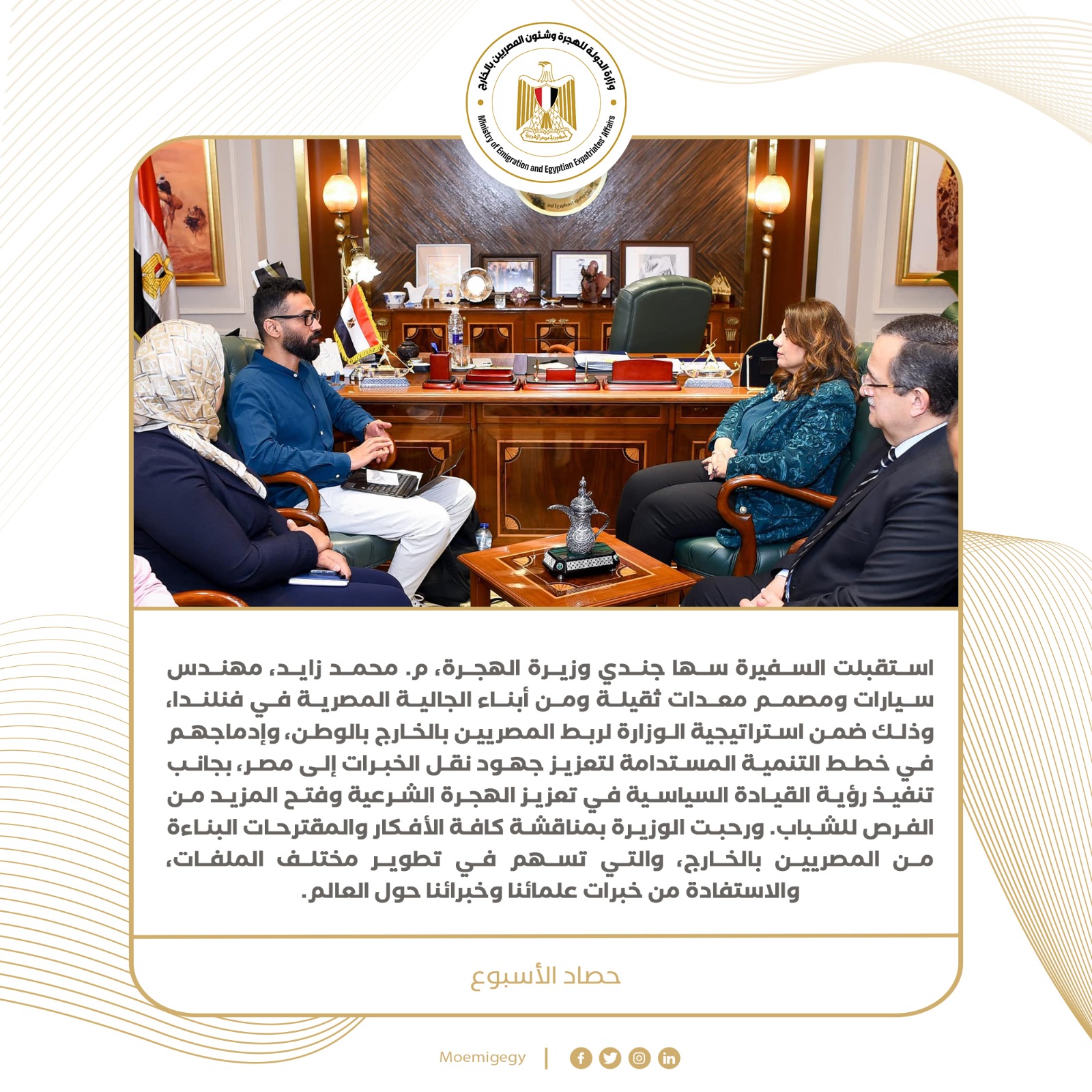 6- استقبلت السفيرة سها جندي وزيرة الهجرة، م. محمد زايد، مهندس سيارات ومصمم معدات ثقيلة ومن أبناء الجالية المصرية في فنلندا، وذلك ضمن استراتيجية الوزارة لربط المصريين بالخارج بالوطن، وإدماجهم في خطط التنمية المستدامة لتعزيز جهود نقل الخبرات إلى مصر، بجانب تنفيذ رؤية القيادة السياسية في تعزيز الهجرة الشرعية وفتح المزيد من الفرص للشباب. ورحبت الوزيرة بمناقشة كافة الأفكار والمقترحات البناءة من المصريين بالخارج، والتي تسهم في تطوير مختلف الملفات، والاستفادة من خبرات علمائنا وخبرائنا حول العالم، ضمن خطط مصر وجهودها في بناء الإنسان، وبشكل خاص في ملفات التعليم والصحة وبشكل خاص ملف التعليم المهني.