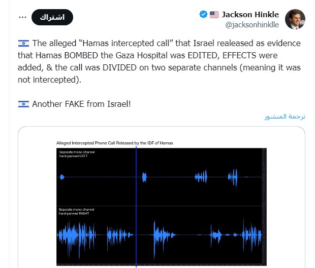 وكتب الممثل الأمريكي جاكسون هينكل عن جرائم إسرائيل فقال: "تم تحرير "المكالمة" التي تم اعتراضها من قبل حماس" والتي أعادت إسرائيل نشرها كدليل على قصف حماس لمستشفى غزة"