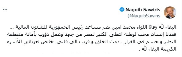 ساويرس ينعى مساعد رئيس الجمهورية للشؤون المالية