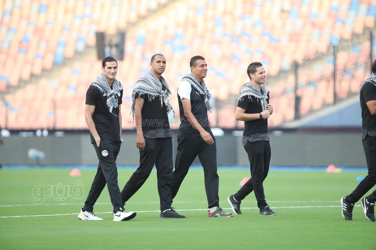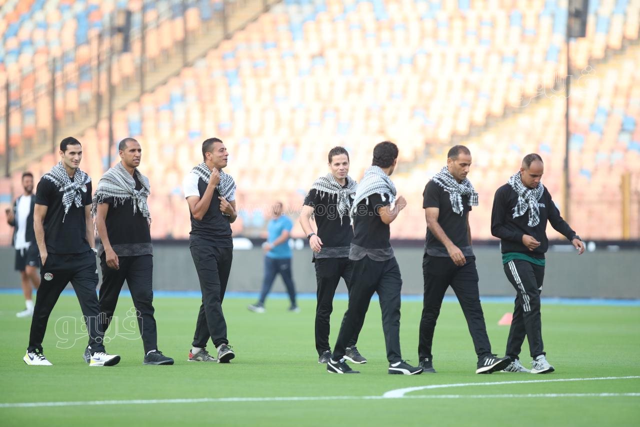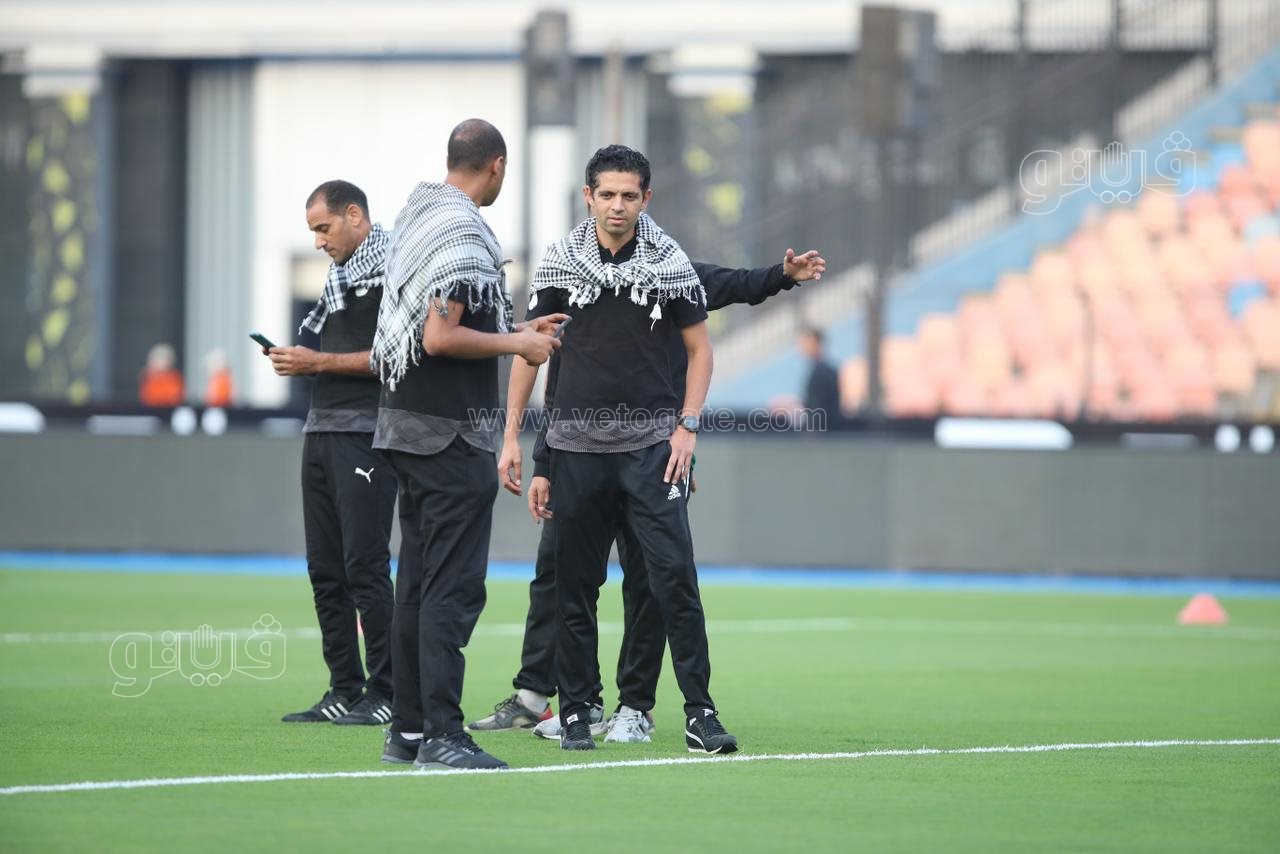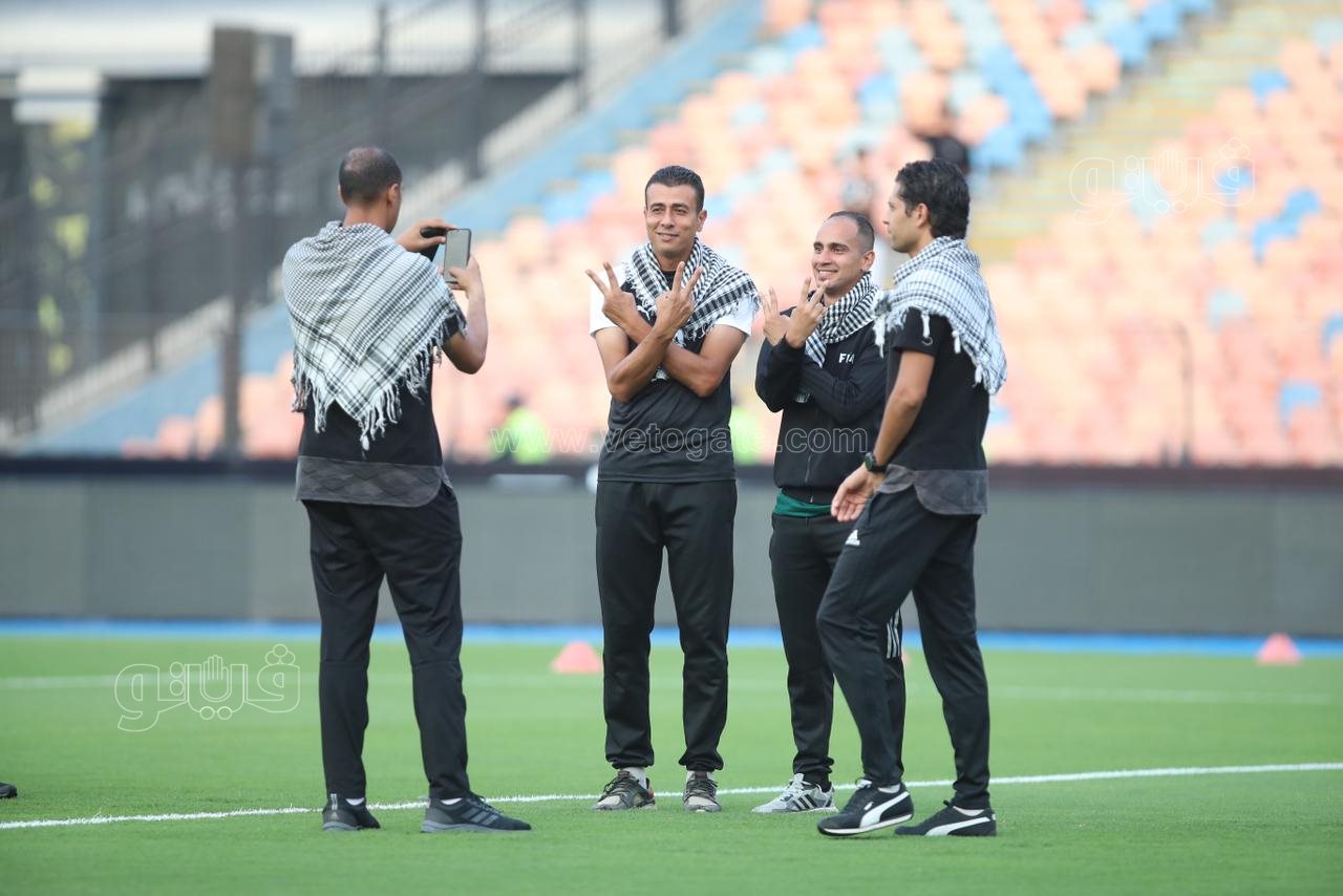وحرص طاقم التحكيم علي ارتداء الشال الفلسطيني ورفع علامة النصر داخل أرضية الملعب، وتنطلق مباراة الزمالك وسموحة في السابعة مساء.