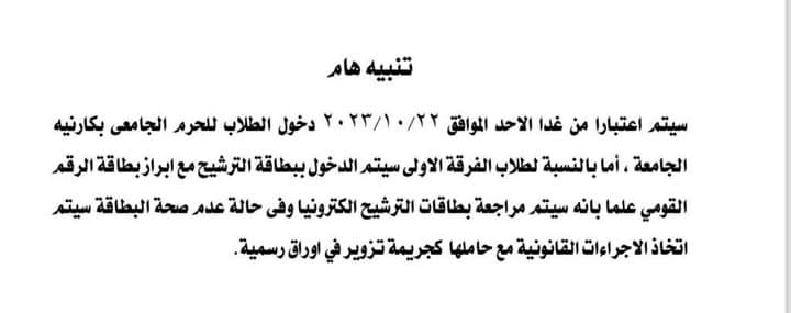 وجاء نص البيان الذي نشرته الصفحة الرسمية لجامعة المنيا،عبر حسابها الشخصي على مواقع التواصل الاجتماعي "فيس بوك " كالتالي " سيتم اعتبارا من غدا الأحد الموافق 22 /10 /2023 دخول الطلاب بكارنية الجامعة، أما بالنسبة لطلاب الفرقة الأولي سوف يتم دخول الطلاب ببطاقة الترشيح مع إبراز الرقم القومي، علما بانه سيتم مراجعة بطاقة الترشيح الإلكترونيا، وفي حالة عدم صحة البطاقة سيتم اتخاذ الإجراءات القانونية مع حاملها كجريمة تزوير في أوراق رسمية"