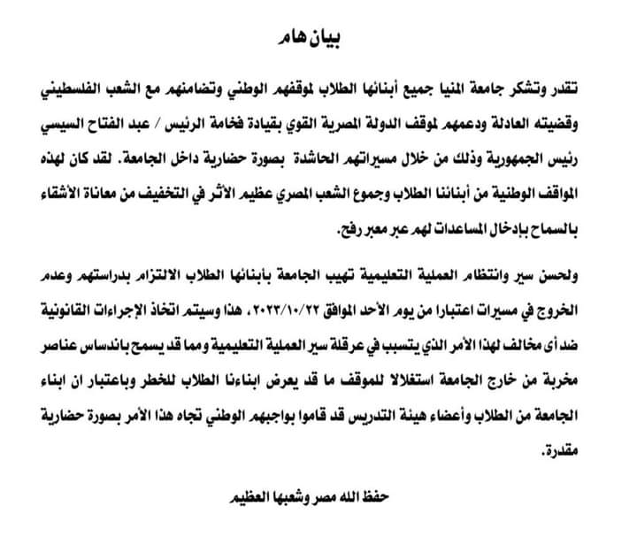 وجاء نص البيان الذي نشرته الصفحة الرسمية لجامعة المنيا كالتالي: «تقدر وتشكر جامعة المنيا جميع أبنائها الطلاب لموقفهم الوطني وتضامنهم مع الشعب الفلسطيني، وقضيته العادلة ودعمهم لموقف الدولة المصرية القوي بقيادة الرئيس عبدالفتاح السيسي من خلال مسيراتهم الحاشدة بصورة حضارية داخل الجامعة، لقد كان لهذه المواقف الوطنية من أبنائنا الطلاب وجموع الشعب المصري عظيم الأثر في التخفيف من معاناة الأشقاء بالسماح بإدخال المساعدات لهم عبر معبر رفح».