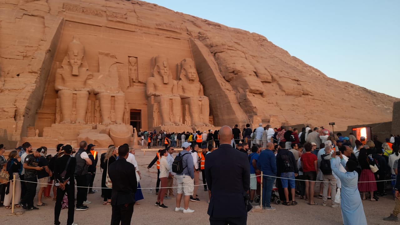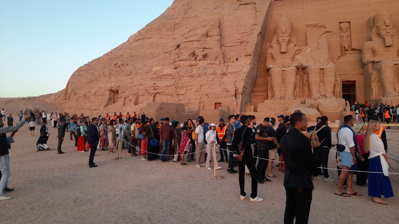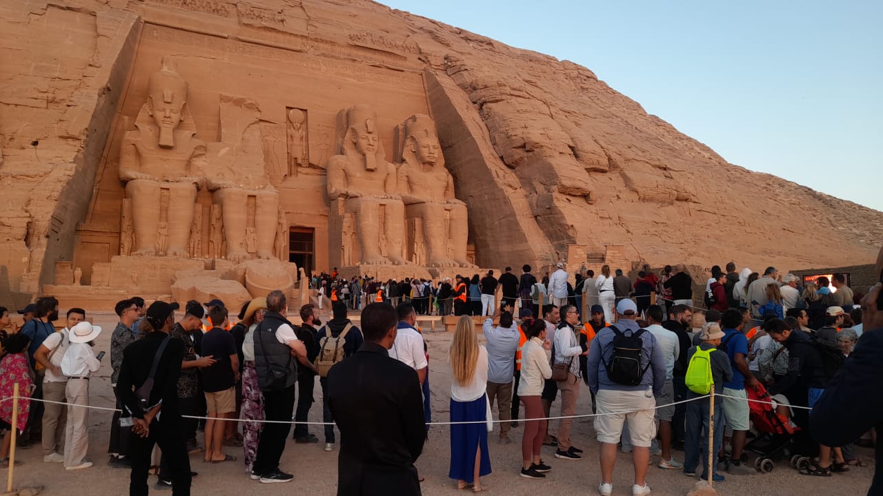وشاهد الظاهرة آلاف السائحين الذين توافدوا على المعبد منذ فجر اليوم الأحد، لانتظار حدوث الظاهرة التى تستغرق ٢٠ دقيقة داخل معبدى رمسيس.