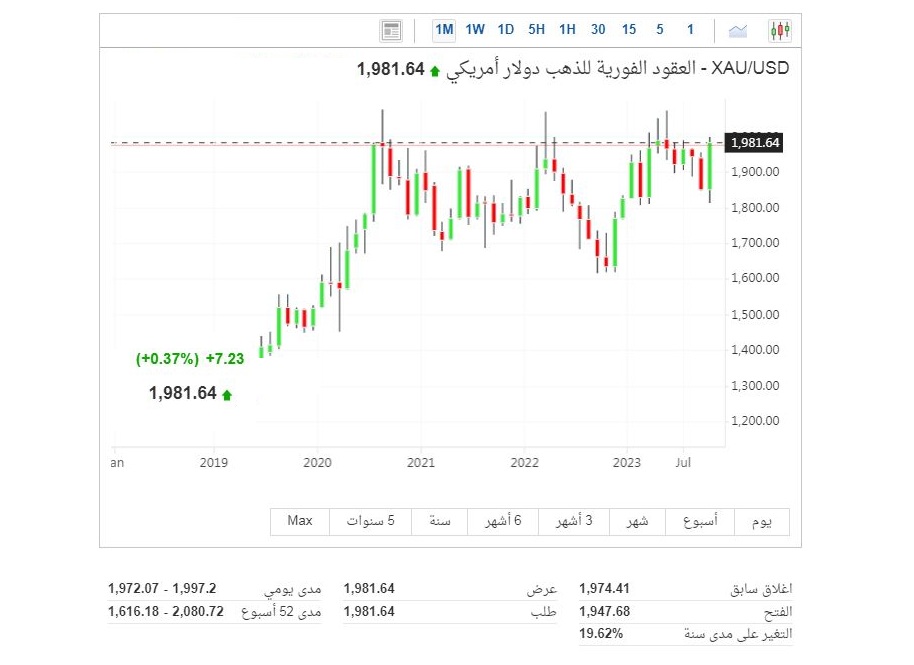 من ناحية أخرى، انخفض مؤشر الدولارالامريكى بنسبة 0.1% إلى 106.1 نقطة، وسجل أعلى مستوى عند 106.4 نقطة وأقل مستوى عند 106.07 نقطة، وعلى صعيد التداولات، ارتفعت العقود الفورية للذهب بنسبة 0.5% أو ما يعادل 10.6 دولار إلى 1991 دولارا للأوقية بعد تجاوز حاجز 2000 دولار.
