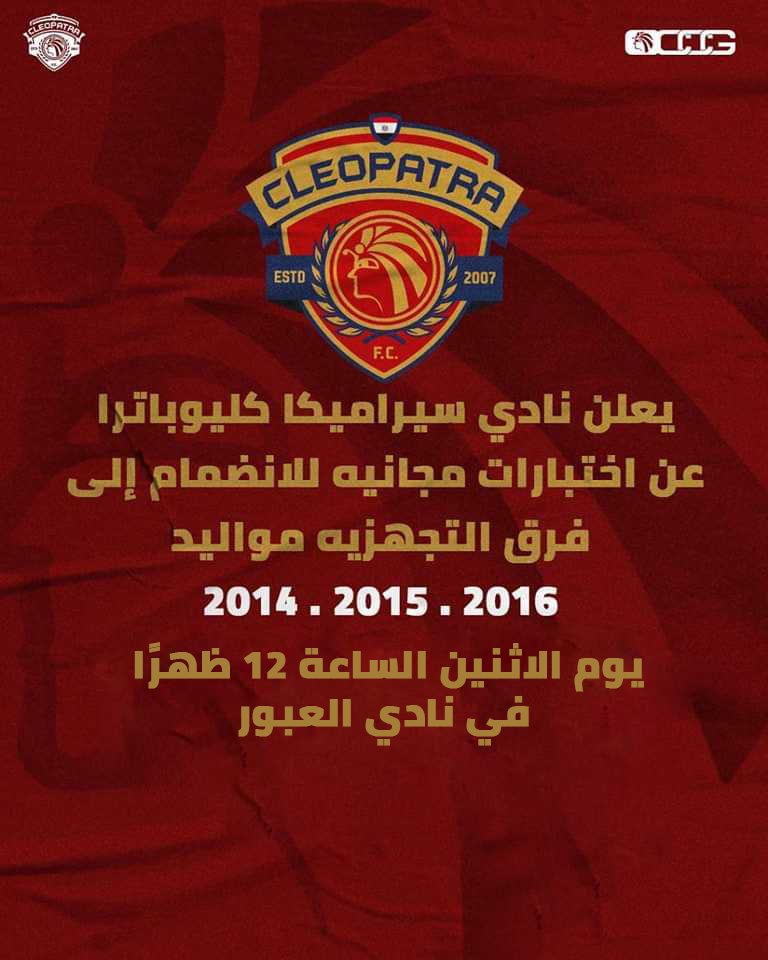 اختبارات الناشئين، أعلن قطاع الناشئين بنادي سيراميكا كليوباترا، إقامة اختبارات الناشئين مجانا لهذه الأعمار السنية (مواليد 2016 -2015 -2014).