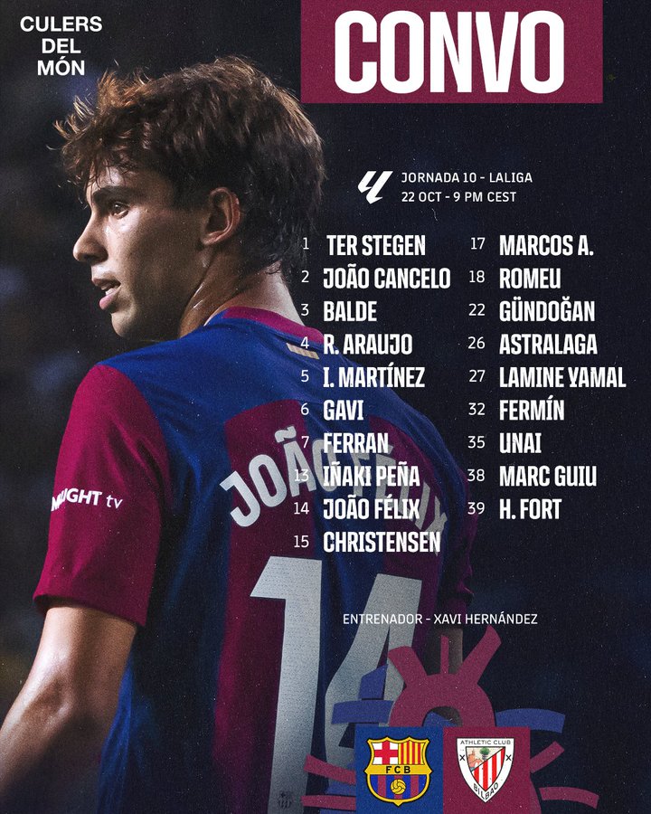 وأعلن تشافي هيرنانديز المدير الفني لفريق برشلونة عن قائمة البارسا للقاء بلباو وضمت كل من