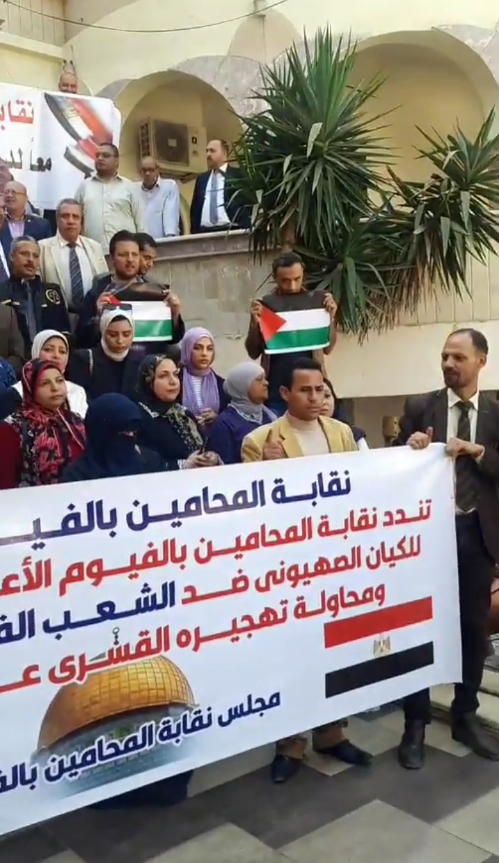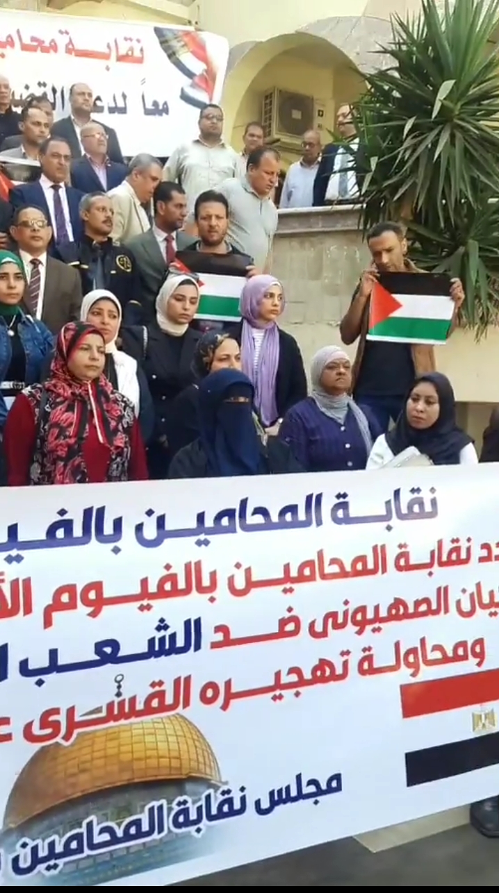 نظمت النقابة الفرعية للمحامين بمحافظة الفيوم، وقفة لدعم القضية الفلسطينية، اليوم الاحد، علي سلم النقابة بشارع بكل السلام بمدينة الفيوم، في الوقفة لجان النقابة بمراكز الفيوم المختلفة.