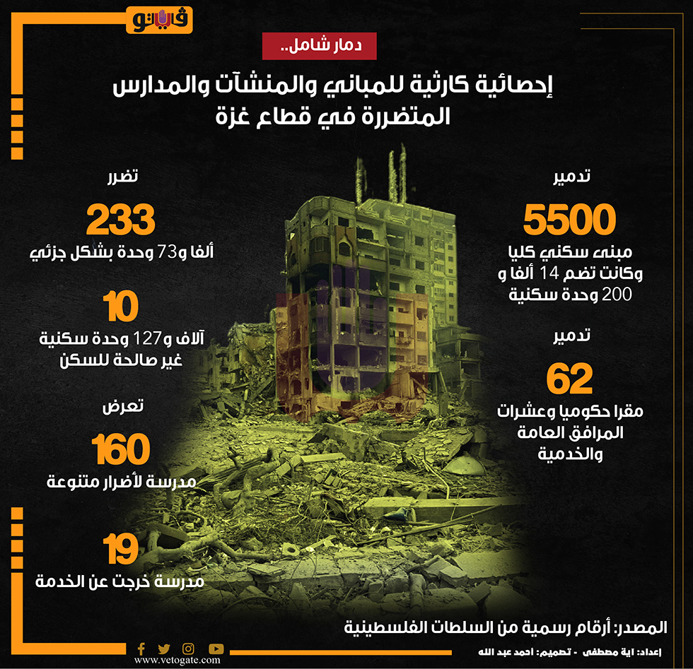 دمار شامل.. إحصائية كارثية للمباني والمنشآت والمدارس المتضررة في قطاع غزة (إنفوجراف) الأحد 22/أكتوبر/2023 - 05:39 م 10/22/2023 5:39:50 PM غزة، فيتو آية مصطفى شارك طباعة 18 حجم الخط شارك طباعة السلطات الفلسطينية قناة اكسترا نيوز قطاع غزة انفوجراف غزة المرافق العامة