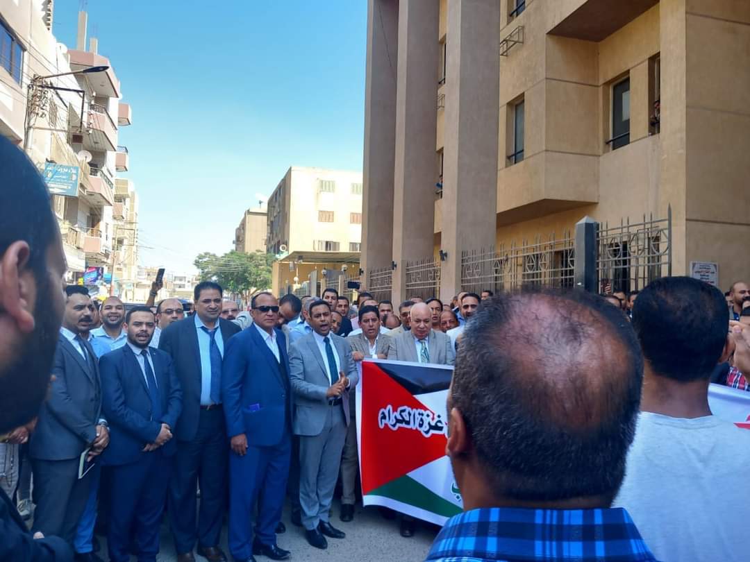 وحرص المئات من المحامين، على التواجد منذ ظهر اليوم أمام المقر الرئيسي لنقابة المحامين وباقي النقابات الفرعية والمحاكم، بالمحافظة، من أجل توصيل رسالة تضامن مع الشعب الفلسطيني.