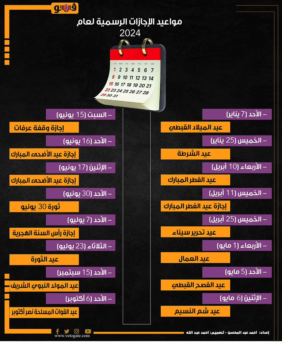 مواعيد الإجازات الرسمية لعام 2024 (انفوجراف ) الإثنين 23/أكتوبر/2023 - 03:30 م 10/23/2023 3:30:27 PM الاجازات الرسمية لعا2024 ,فيتو أحمد عبدالمحسن شارك طباعة 18 حجم الخط شارك طباعة عيد الأضحي المبارك عيد الفطر المبارك عيد تحرير سيناء ثورة 30 يونيو الاجازات الرسمية اجازة عيد الفطر المبارك