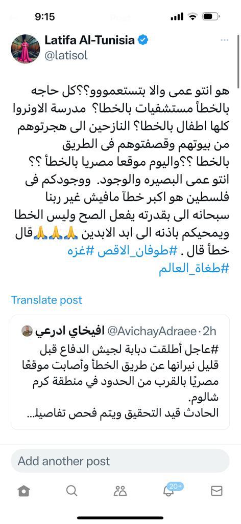 وكتبت لطيفة عبر صفحتها الرسمية بموقع التدوينات تويتر "X": "هو انتو عمى ولا بتستعمووو؟؟، كل حاجه بالخطأ، مستشفيات بالخطأ؟ مدرسة الاونروا كلها أطفال بالخطأ؟، النازحين اللى هجرتوهم من بيوتهم وقصفتوهم فى الطريق بالخطأ ؟".
