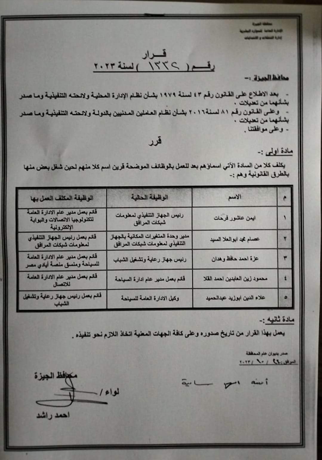 أصدر اللواء أحمد راشد محافظ الجيزة قرارا بتعيين: أيمن عاشور فرحات مدير عام الإدارة العامة لتكنولوجيا الاتصالات والبوابة الإلكترونية بمحافظة الجيزة، وعصام محمد أبو العلا السيد رئيس الجهاز التنفيذى لمعلومات شبكات المرافق بمحافظة الجيزة، وعزة أحمد وهدان مدير عام الإدارة العامة للسياحة ومنسق منصة أيادي مصر بمحافظة الجيزة ومحمود زين العابدين أحمد مدير عام الإدارة العامة للاتصال بمحافظة الجيزة وعلاء الدين ابو زيدرئيس جهاز تشغيل الشباب بمحافظة الجيزة.