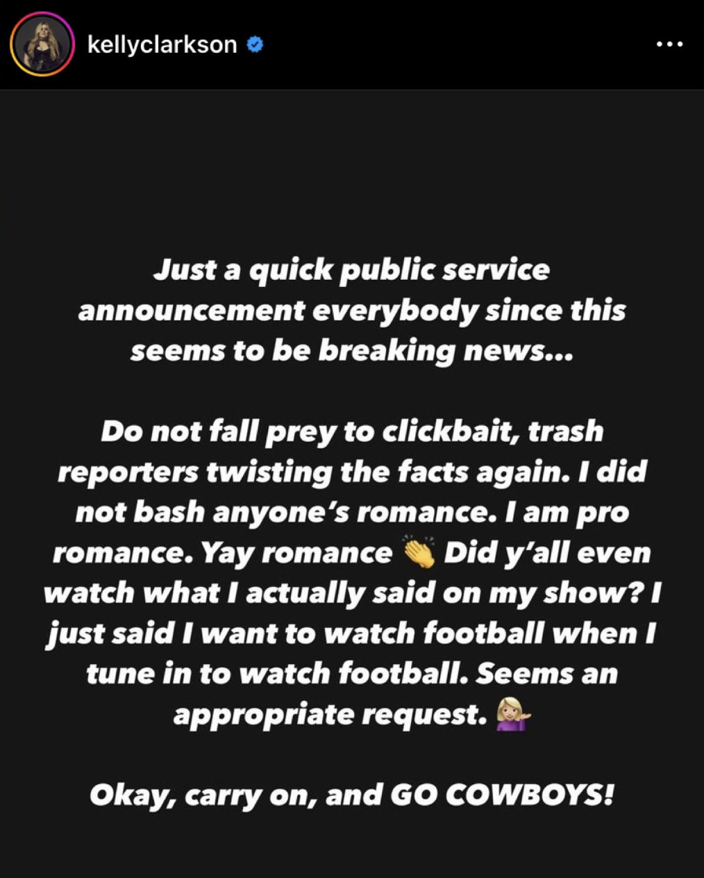 وكتبت كيلي كلاركسون قائلة عبر خاصية الأستوري:"أنا لم أهاجم رومانسية أي شخص… أنا مؤيدة للرومانسية... لقد قلت للتو أنني أريد مشاهدة كرة القدم، عندما أتابع مشاهدة كرة القدم.. يبدو وكأنه طلب مناسب".