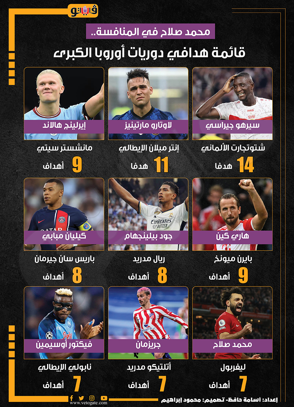 محمد صلاح في المنافسة.. قائمة هدافي دوريات أوروبا الكبرى (إنفوجراف) الثلاثاء 24/أكتوبر/2023 - 11:45 ص 10/24/2023 11:45:34 AM محمد صلاح، فيتو اسامة حافظ شارك طباعة 18 حجم الخط شارك طباعة أتلتيكو مدريد إنتر ميلان الإيطالي إيرلينج هالاند مهاجم مانشستر سيتي باريس سان جيرمان بايرن ميونخ جود بيلينجهام شتوتجارت الالماني لاوتارو مارتينيز كيليان مبابي محمد صلاح لاعب ليفربول محمد صلاح