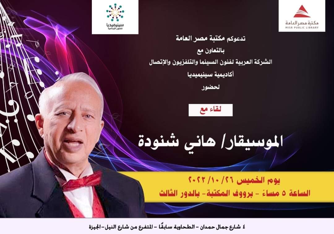 وكانت مكتبة مصر العامة دعت قبل ذلك بالتعاون مع الشركة العربية لفنون السينما والتلفزيون والإتصال "أكاديمية سينيميديا" لحضور لقاء الموسيقار هاني شنودة وذلك يوم الخميس.