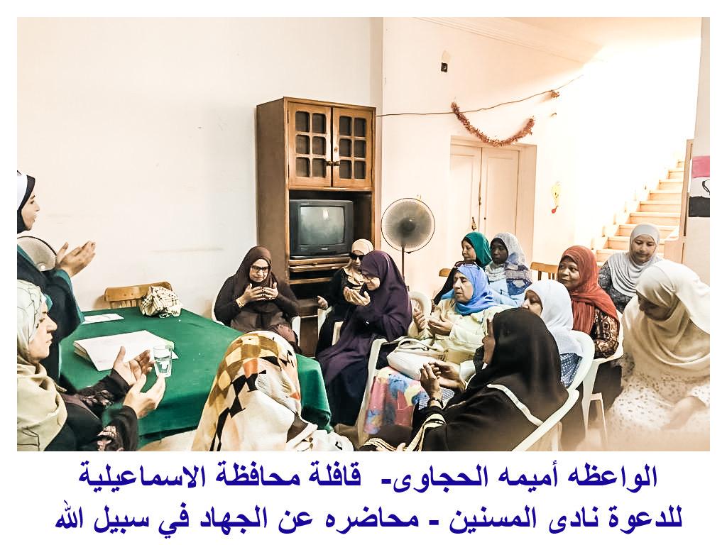 والقت الواعظة أميمة الحجاوي، محاضرة دينية توعوية لطالبات المدرسة الثانوية الصناعية بالإسماعيلية، بالاضافة إلى إلقاء درس بمسجد التوحيد بالإسماعيلية الواقع خلف مجمع المحاكم وتحدثت خلال المحاضرة عن أسباب النصر، كما تناولت تفسيرا ميسرا لبعض آيات الذكر الحكيم من سورة البقرة.