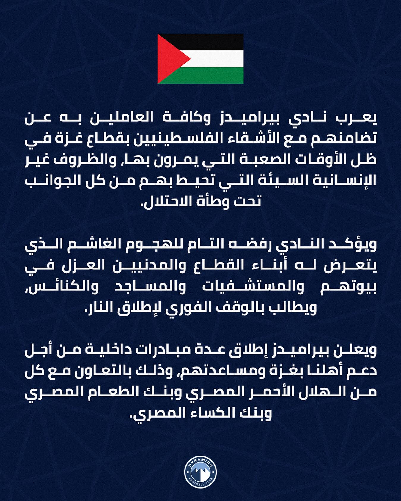 أخيرا، بيراميدز يعلن دعمه للشعب الفلسطيني في بيان رسمي