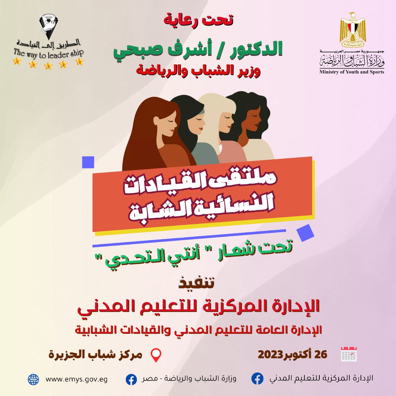 تُطلق وزارة الشباب والرياضة من خلال الإدارة المركزية للتعليم المدني، بعد غدٍ الخميس، فعاليات المُلتقي الأول للقيادات النسائية الشابة، الذي يحمل شعار "أنتي التحدي"، وذلك بالقاعة الرئيسية بمركز شباب الجزيرة، وتحت رعاية الدكتور أشرف صبحي ؛ وزير الشباب والرياضة.
