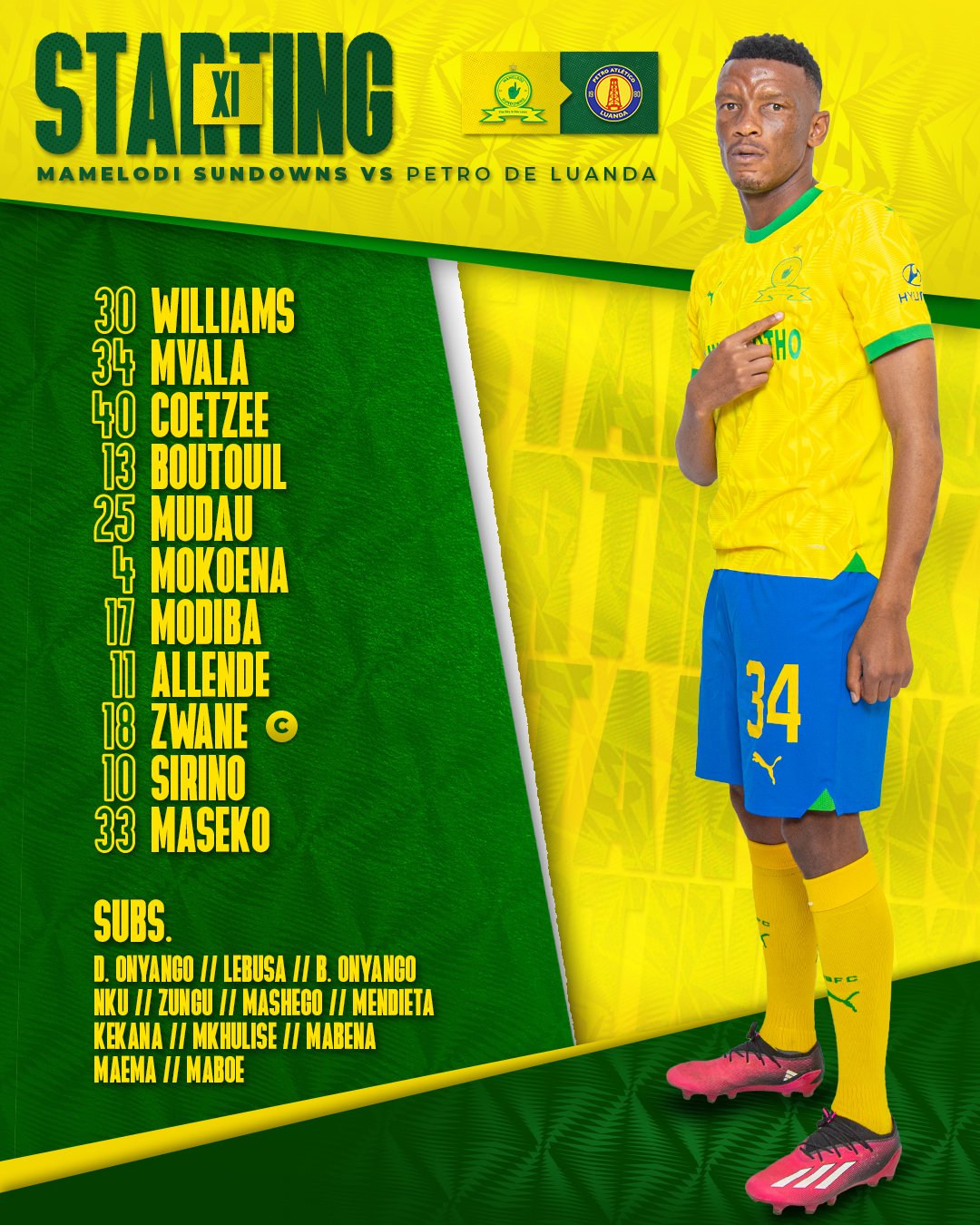 أعلن رولانى موكوينا المدير الفني لفريق صن داونز الجنوب تشكيل فريقه لمواجهة بترو أتلتيكو الأنجولي والذي جاء كالتالي: