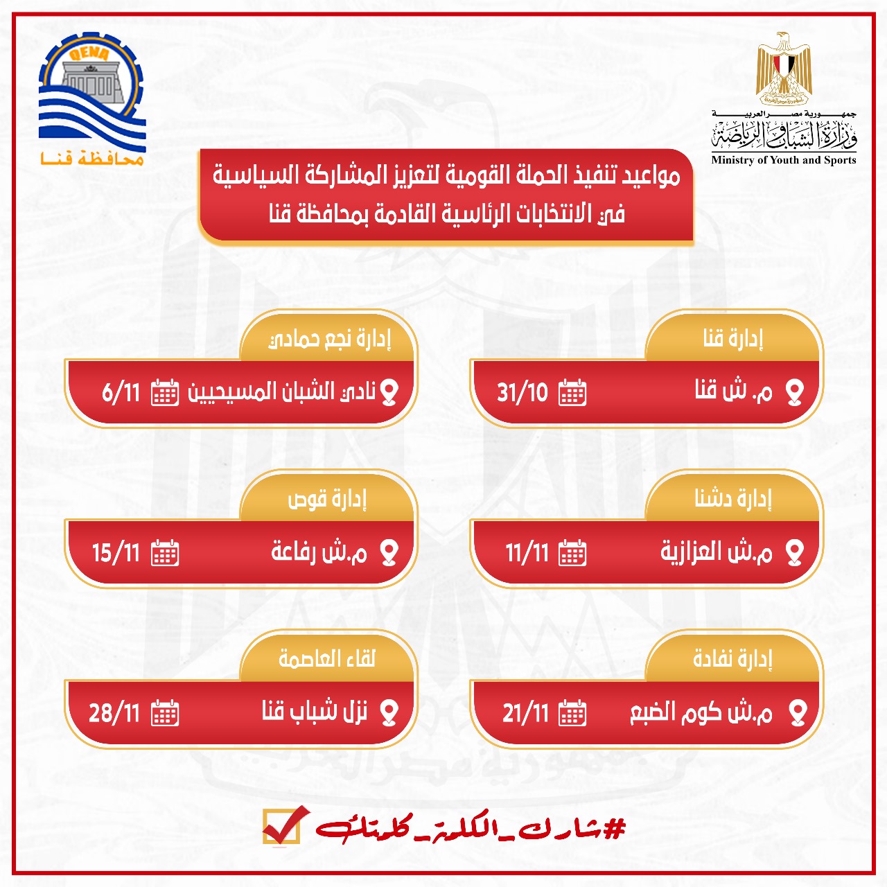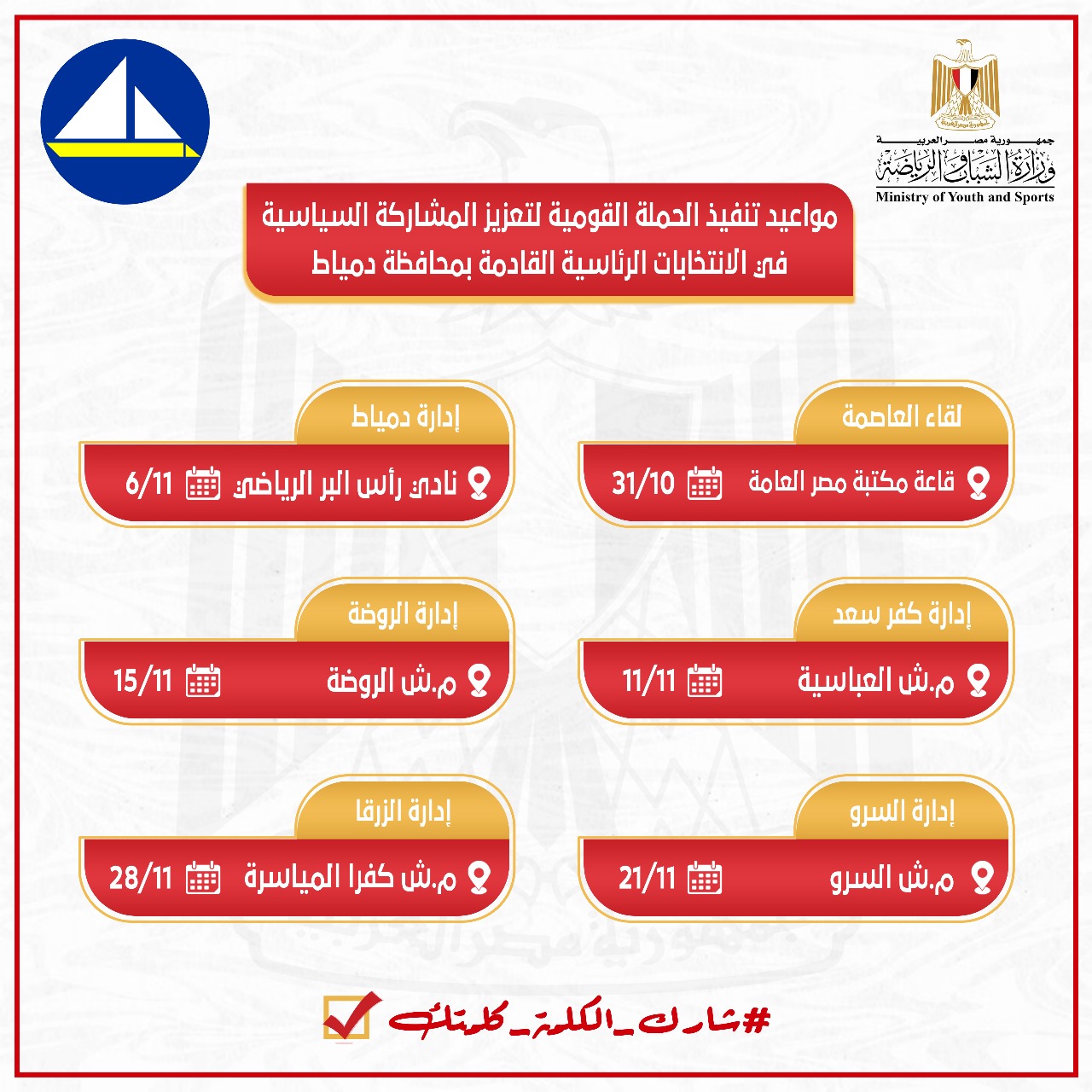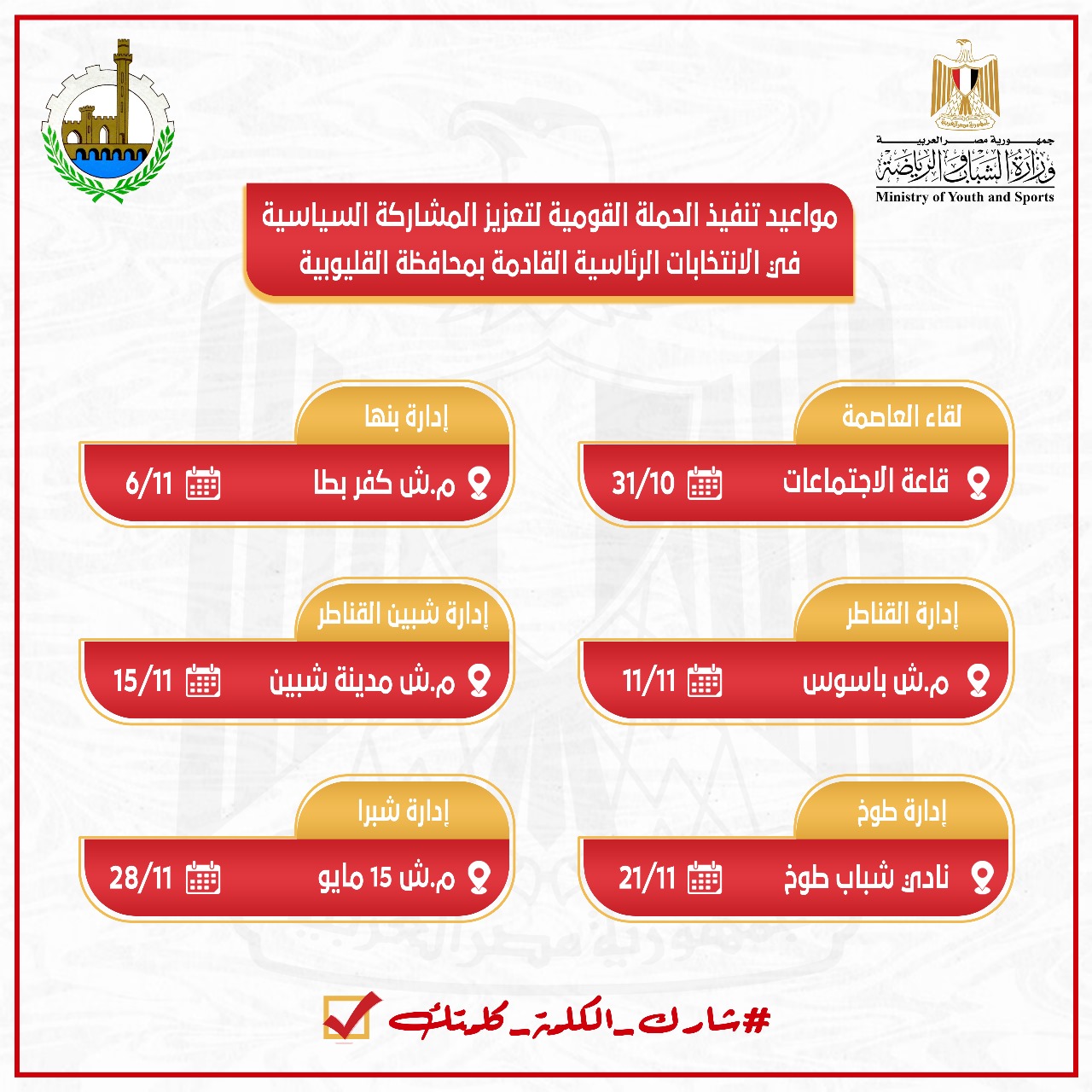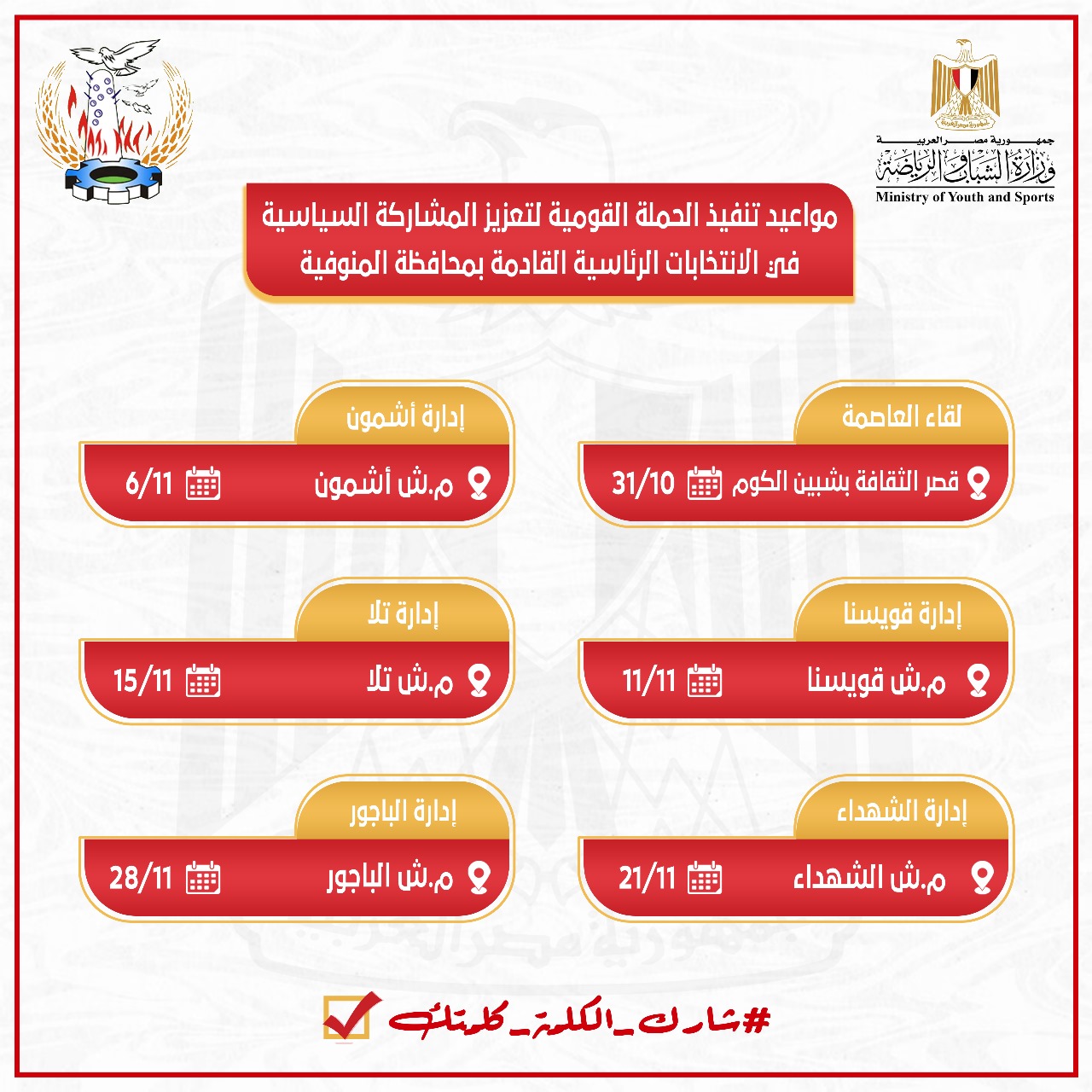 أعلنت وزارة الشباب والرياضة، من خلال الإدارة المركزية للتعليم المدني، عن مواعيد وأماكن تنفيذ الحملة القومية لتعزيز المشاركة السياسية لشباب مصر في الانتخابات الرئاسية القادمة بــ 7 محافظات كمرحلة أولى.