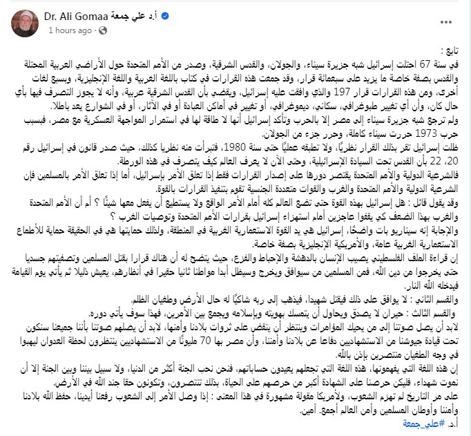 وقال الدكتور علي جمعة عن أحداث غزة والقضية الفلسطينية: "في سنة 67 احتلت إسرائيل شبه جزيرة سيناء، والجولان، والقدس الشرقية، وصدر من الأمم المتحدة حول الأراضي العربية المحتلة والقدس بصفة خاصة ما يزيد على سبعمائة قرار، وقد جمعت هذه القرارات في كتاب باللغة العربية واللغة الإنجليزية، وبسبع لغات أخرى، ومن هذه القرارات قرار 197 والذي وافقت عليه إسرائيل، ويقضي بأن القدس الشرقية عربية، وأنه لا يجوز التصرف فيها بأي حال كان، وأن أي تغيير طبوغرافي، سكاني، ديموغرافي، أو تغيير في أماكن العبادة أو في الآثار، أو في الشوارع يعد باطلا."