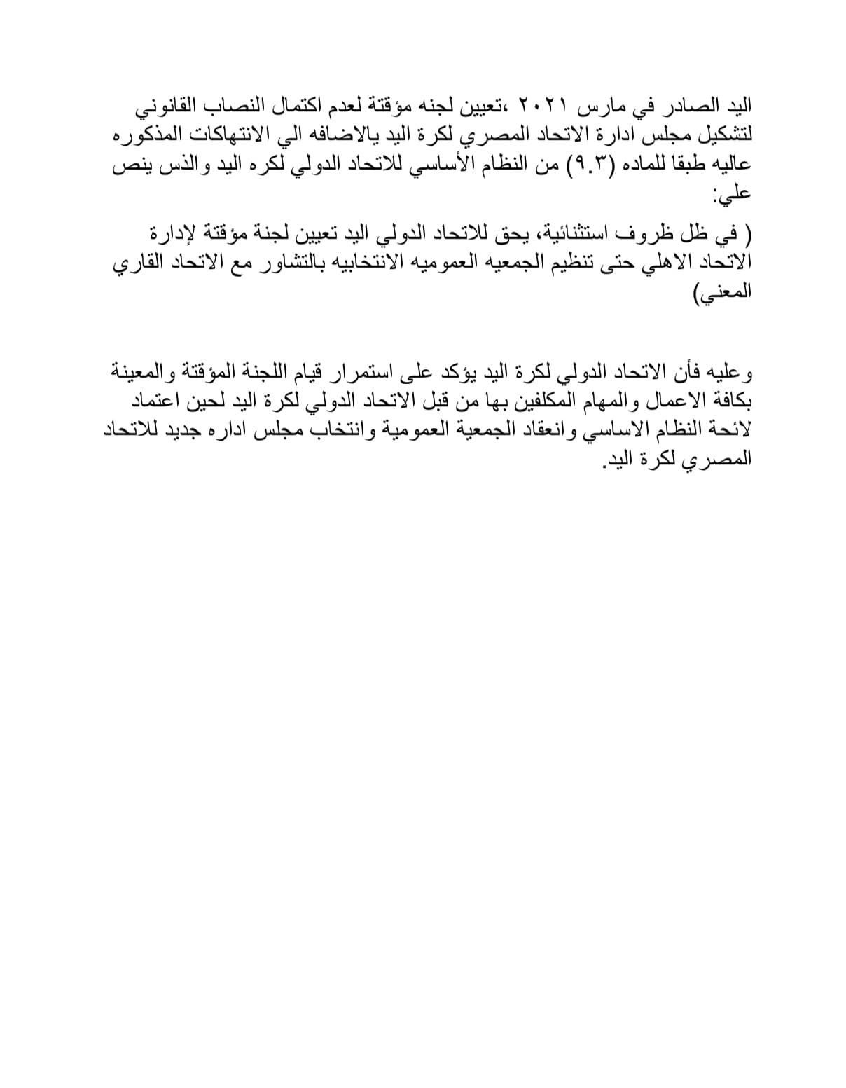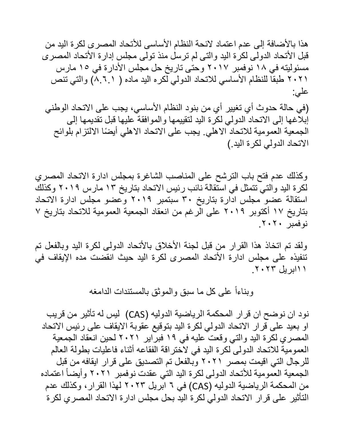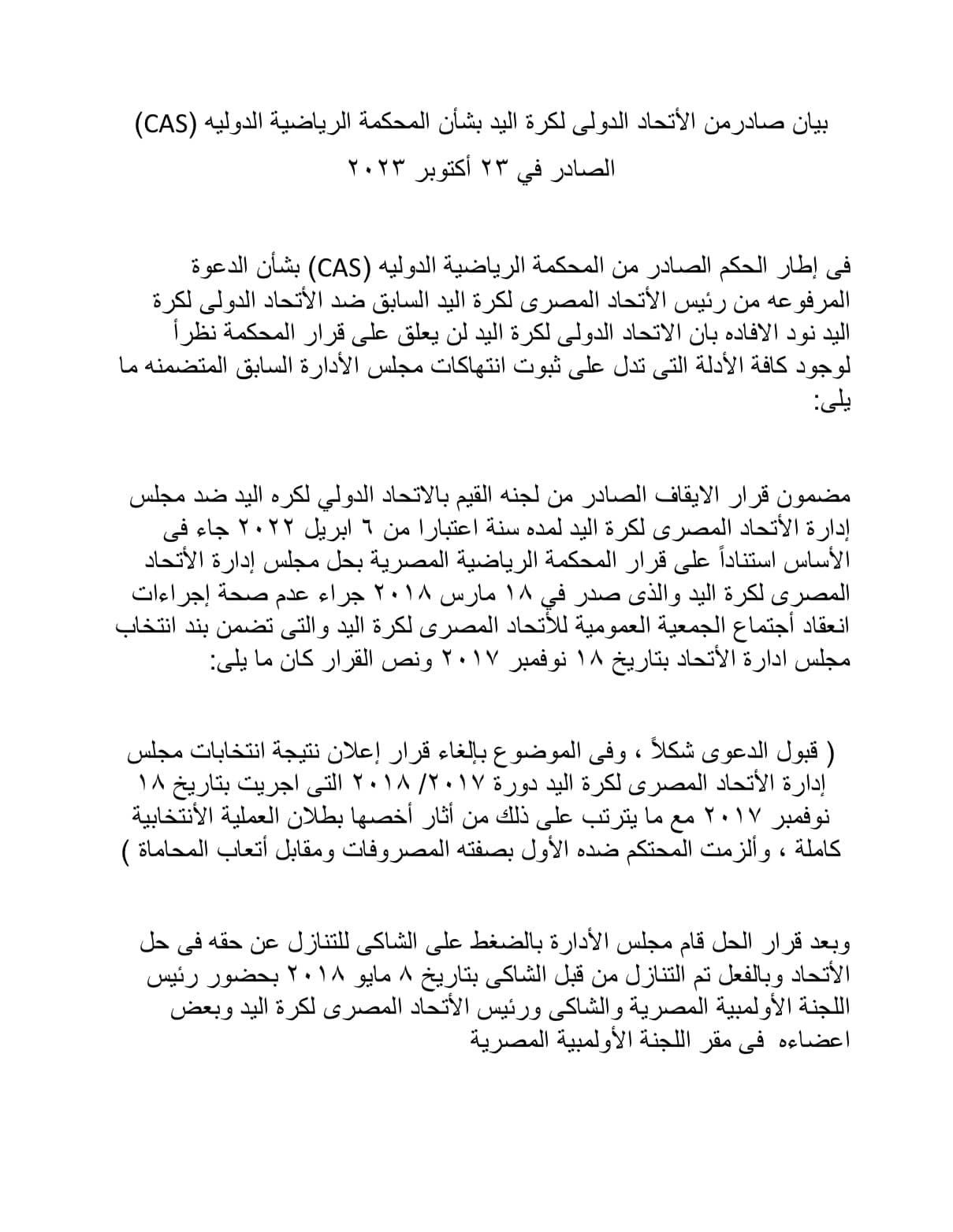 كرة اليد، أصدر الاتحاد الدولي لكرة اليد بيانًا للرد على حكم المحكمة الرياضية الدولية بشأن قبول الطعن المقدم من هشام نصر رئيس مجلس إدارة الاتحاد المصري لكرة اليد السابق ونائب رئيس نادي الزمالك الحالي، وإلغاء قرار الاتحاد الدولي لكرة اليد بإيقافه ومجلسه لمدة عام.
