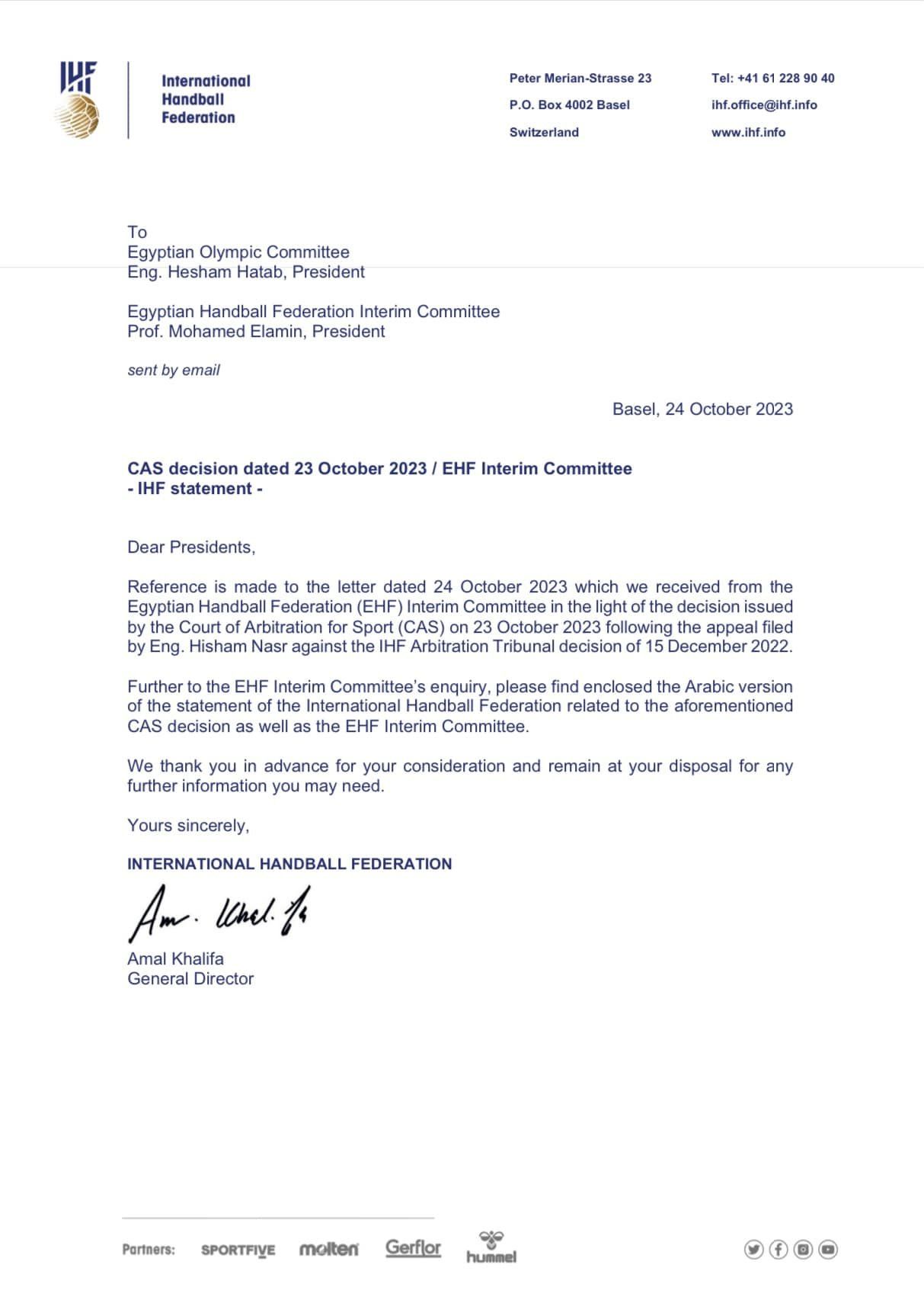 الاتحاد الدولي لكرة اليد يرد على حكم المحكمة الرياضية بشأن قبول طعن هشام نصر