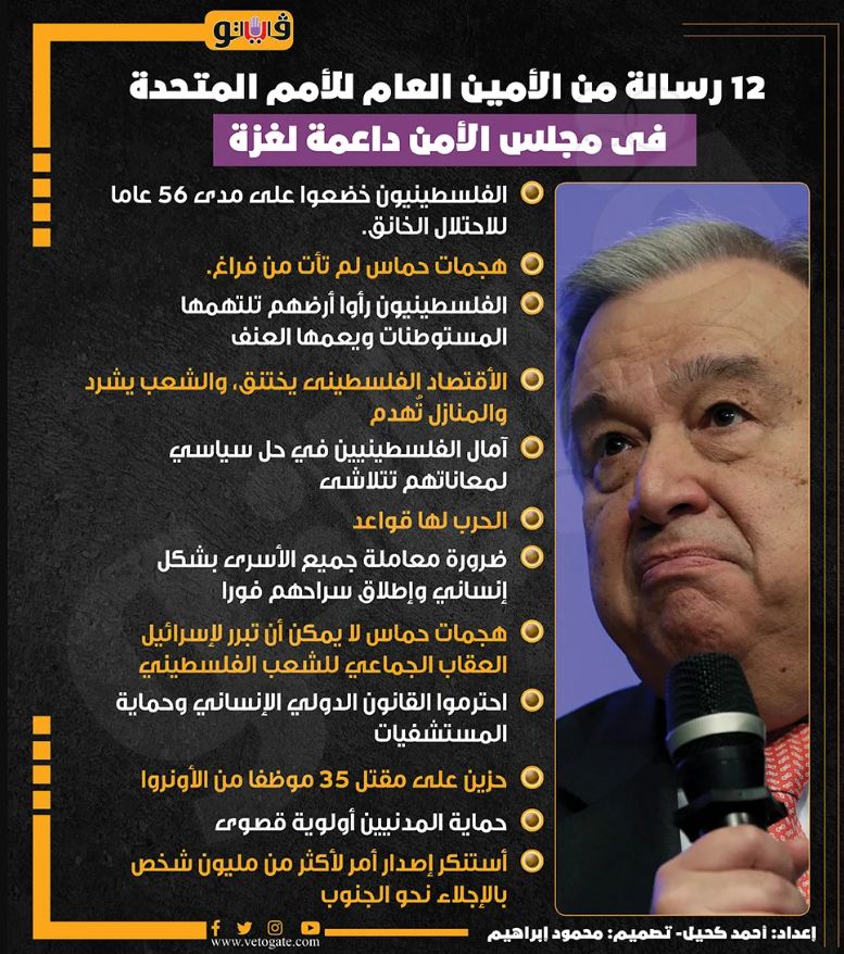 تصريحات الأمين العام للأمم المتحدة، أنطونيو جوتيريش، التي أظهر فيها الوجه القبيح للمحتل الإسرائيلي، والتمس العذر لشعب قابع تحت الاحتلال فقد الأمل في الغد، واعتبر أن ما قامت به حماس يوم 7 أكتوبر -في إشارة إلى طوفان الأقصى- لم يأتِ من فراغ.
