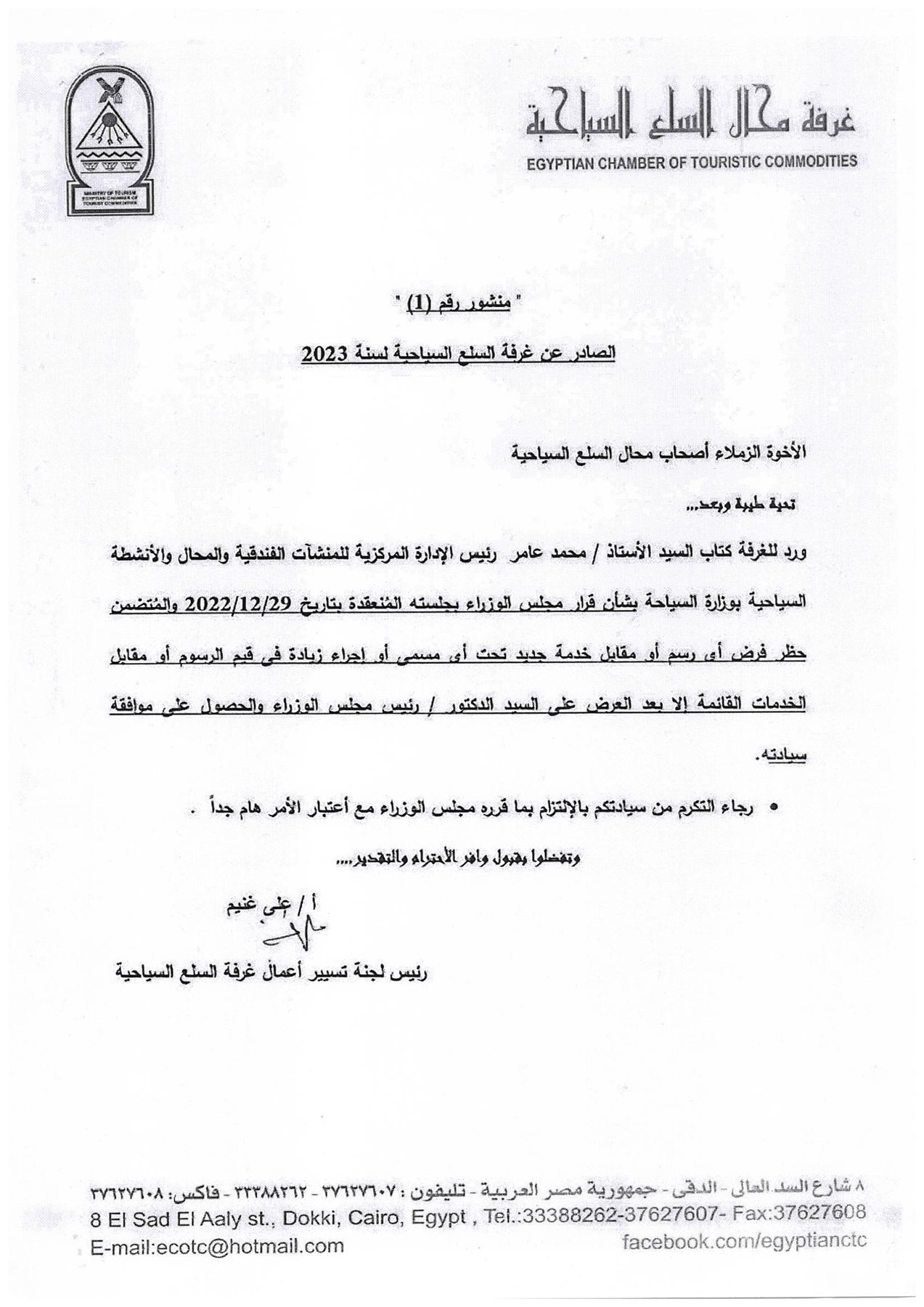 وقالت غرف السياحة انها تلقت اخطارا الادارة المركزية للمنشأت الفندقية والمحال والانشطة السياحية بوازرة السياحة والاثار، بشان قرار رئيس مجلس الوزراء والمتضمن حظر فرض اي رسم أو مقابل خدمة جديد تحت اي مسمي او اجراء زيادة في قيم الرسوم او مقابل الخدمات القائمة الا بعد العرض علي رئيس مجلس الوزراء والحصول علي موافقته.