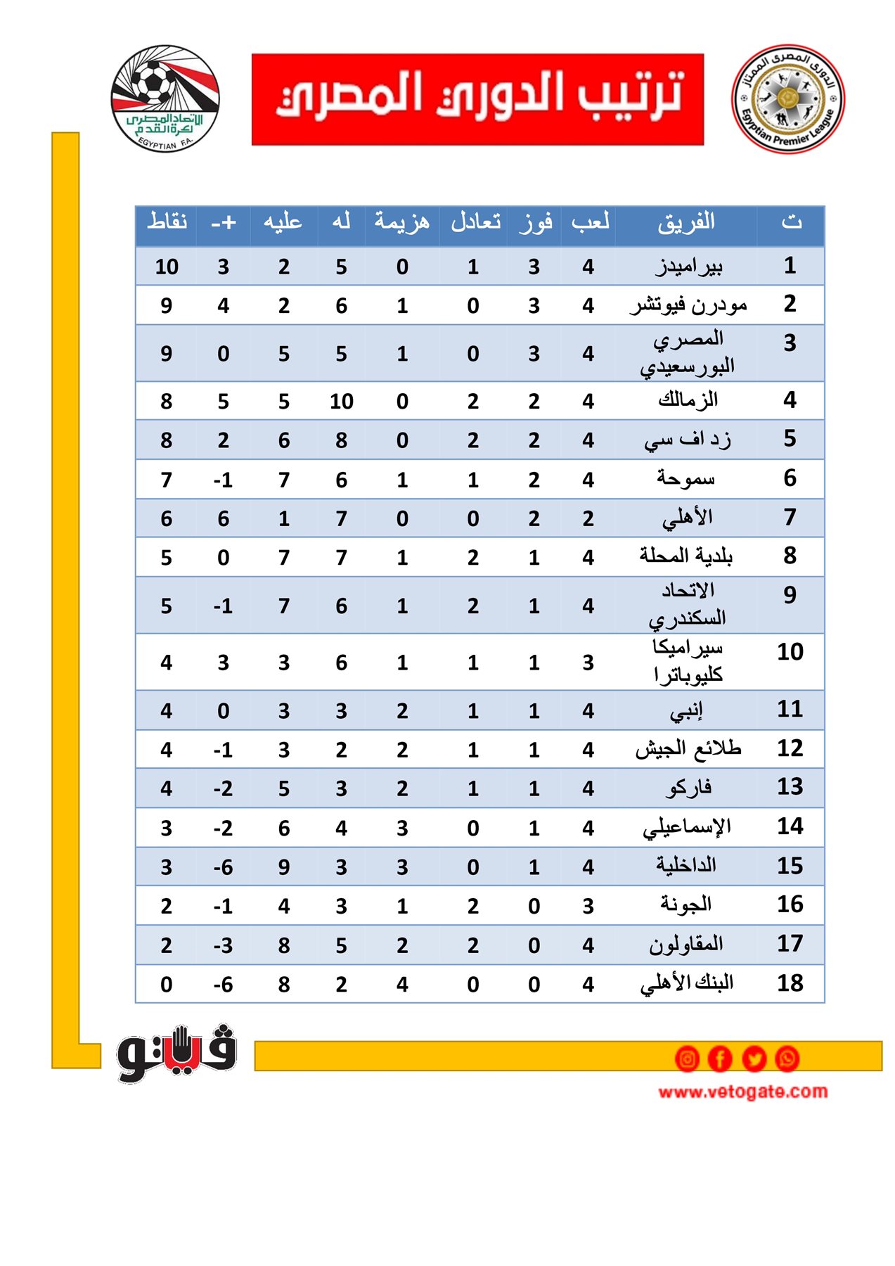 ترتيب فرق الدوري المصري بعد الجولة الرابعة