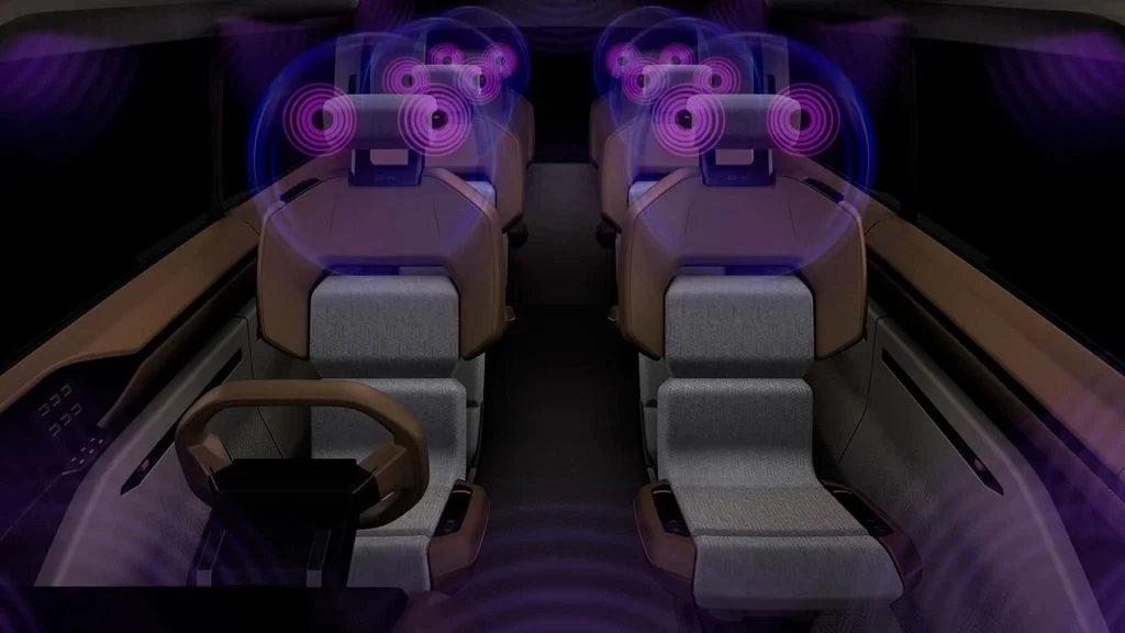 هذه المقاعد المغطاة بالجلد البني، لا تنزلق للأمام والخلف فحسب، بل تدور المقاعد الأمامية أيضًا بمقدار 180 درجة. يوجد زوج من مكبرات الصوت من ياماها مثبتة في كل مسند رأس، بينما تم تقوية الجسم بأعمدة خلفية مصنوعة من إطار عظمي معزز بهيكل إطاري دائري.