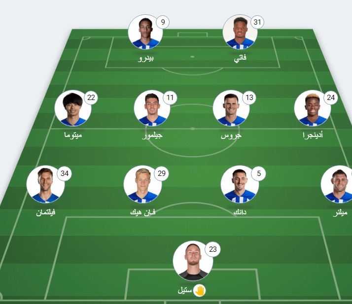الدوري الأوروبي، أعلن الإيطالي دي زيربي المدير الفني لنادي برايتون عن تشكيل فريقه استعدادا لمواجهة أياكس أمستردام في الجولة الثالثة من اليورباليج، المباراة المقرر إقامتها على ملعب أمريكان إكسبريس معقل فريق برايتون.