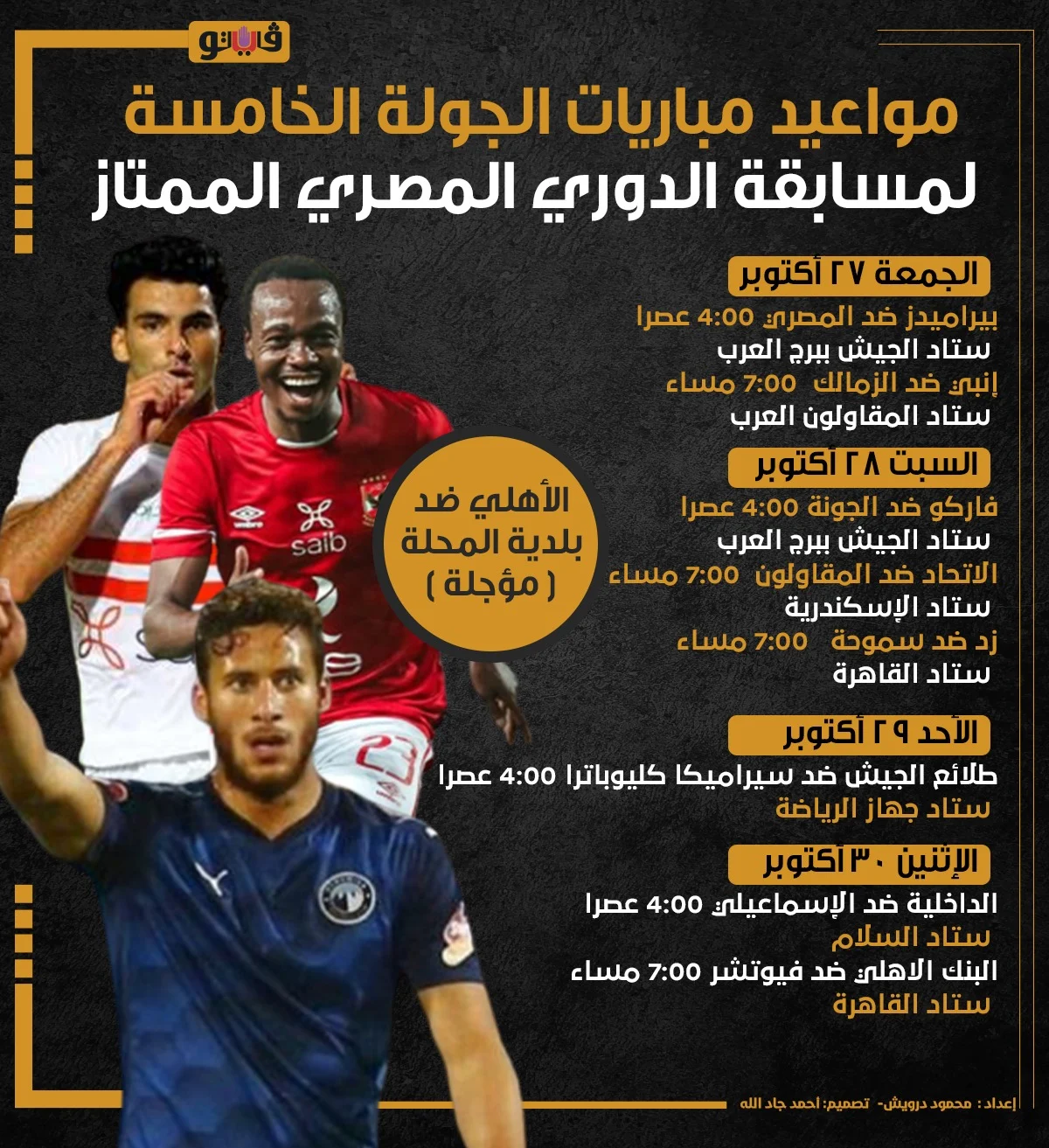 مواعيد مباريات الجولة الخامسة لبطولة الدوري المصري الممتاز