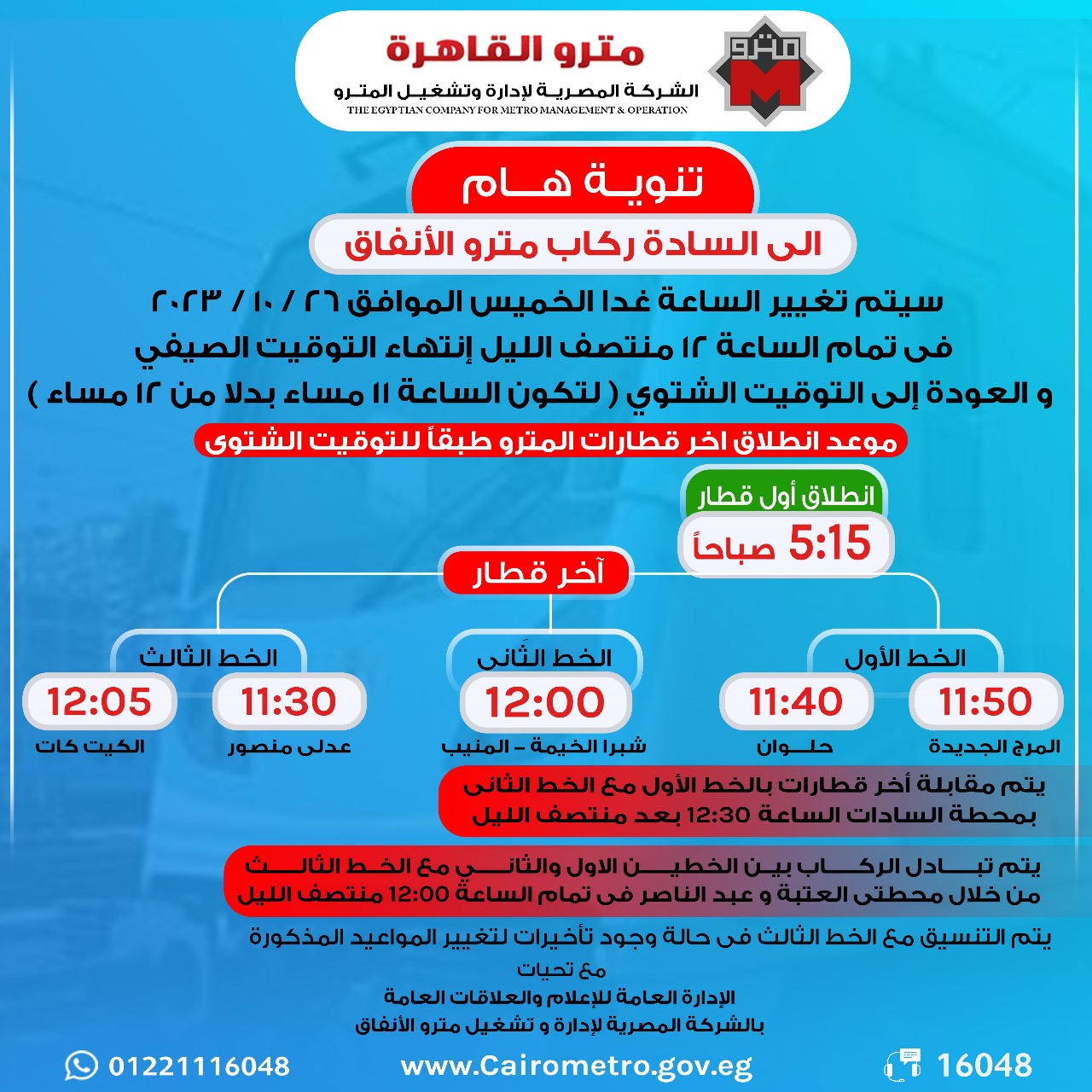 -يتم مقابلة آخر قطار للخط الأول مع الخط الثالث بمحطة جمال عبدالناصر الساعة ١٢:٠٠ ص.